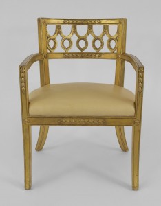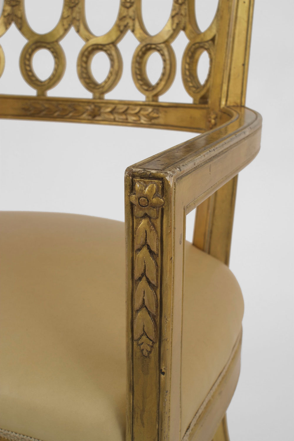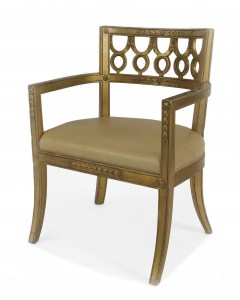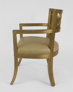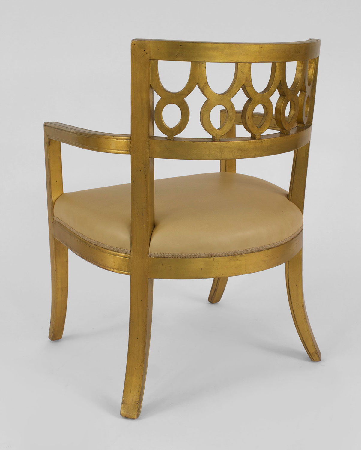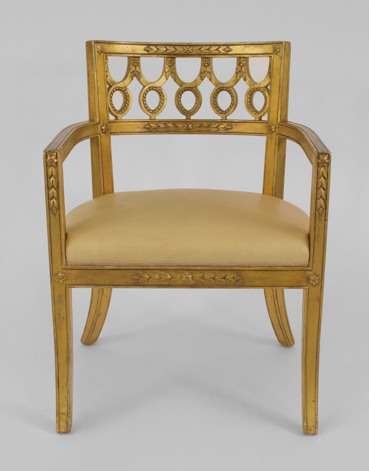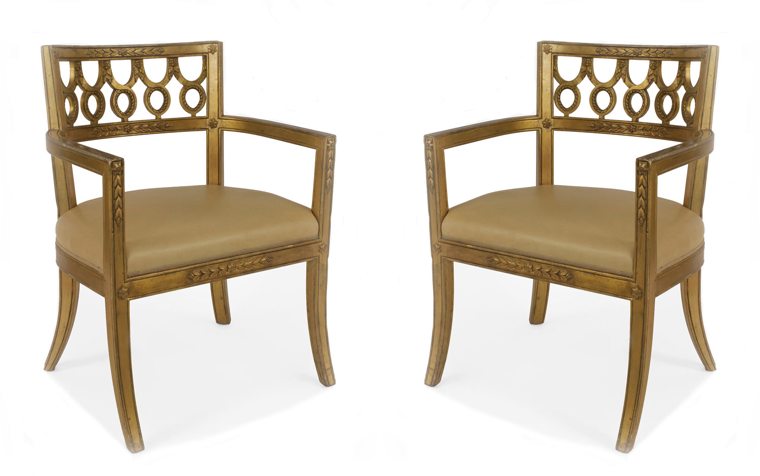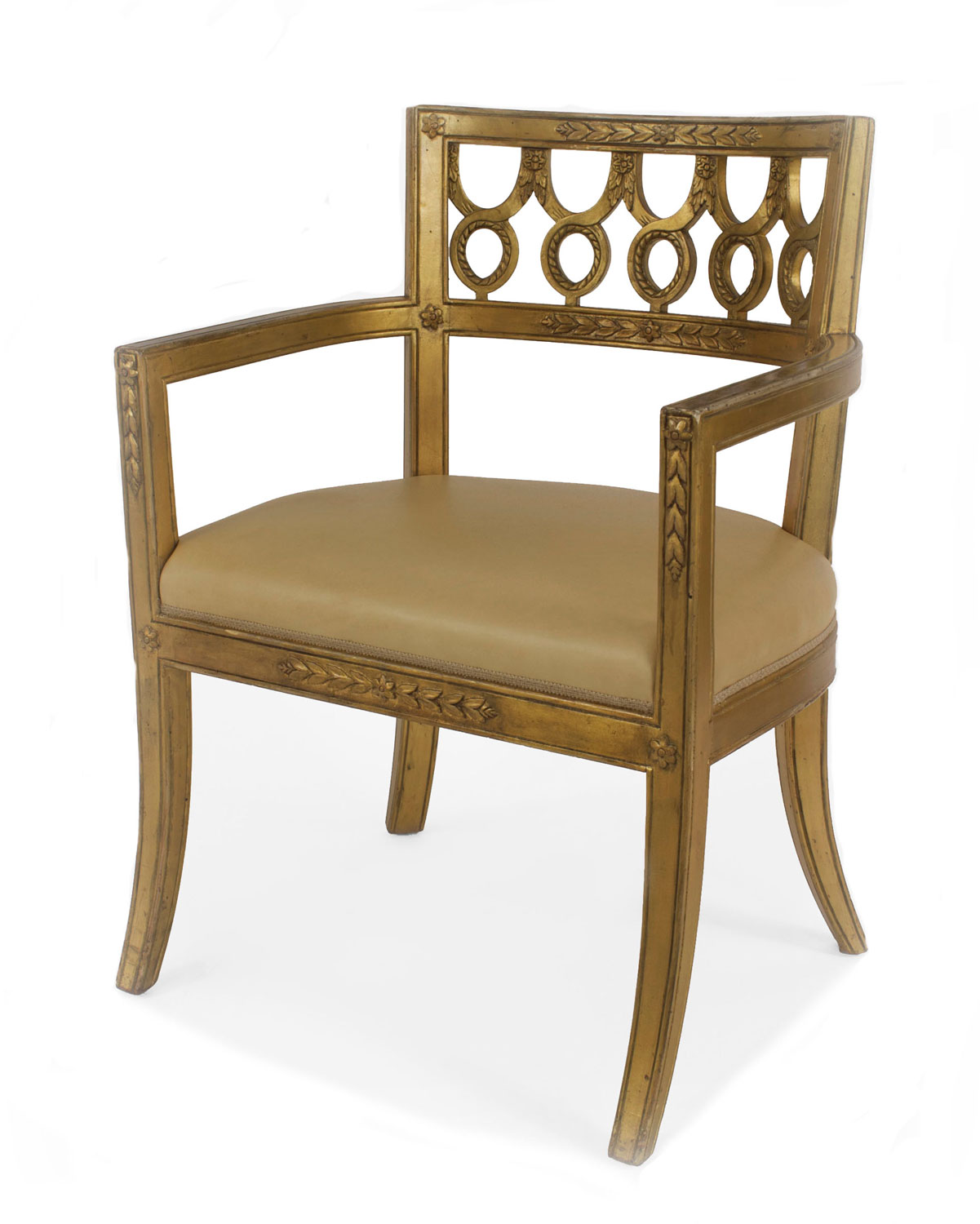 Set of 12 Italian Neoclassic-style gilt wood arm chairs with a round back with a carved circle design & upholstered tan leather seats..