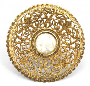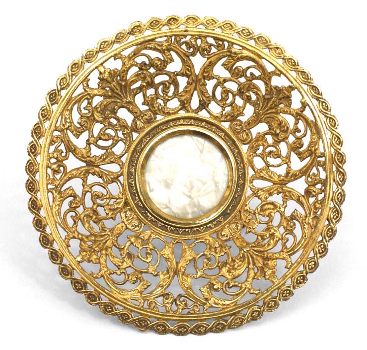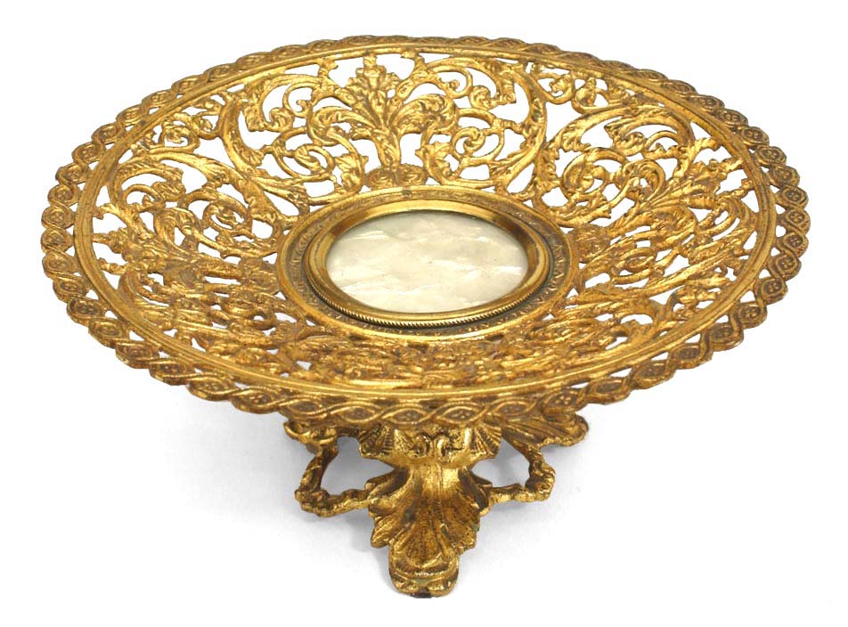 Italian Neo-classic (19th Century) bronze dore filigree pedestal base compote with pearl veneer round center center.