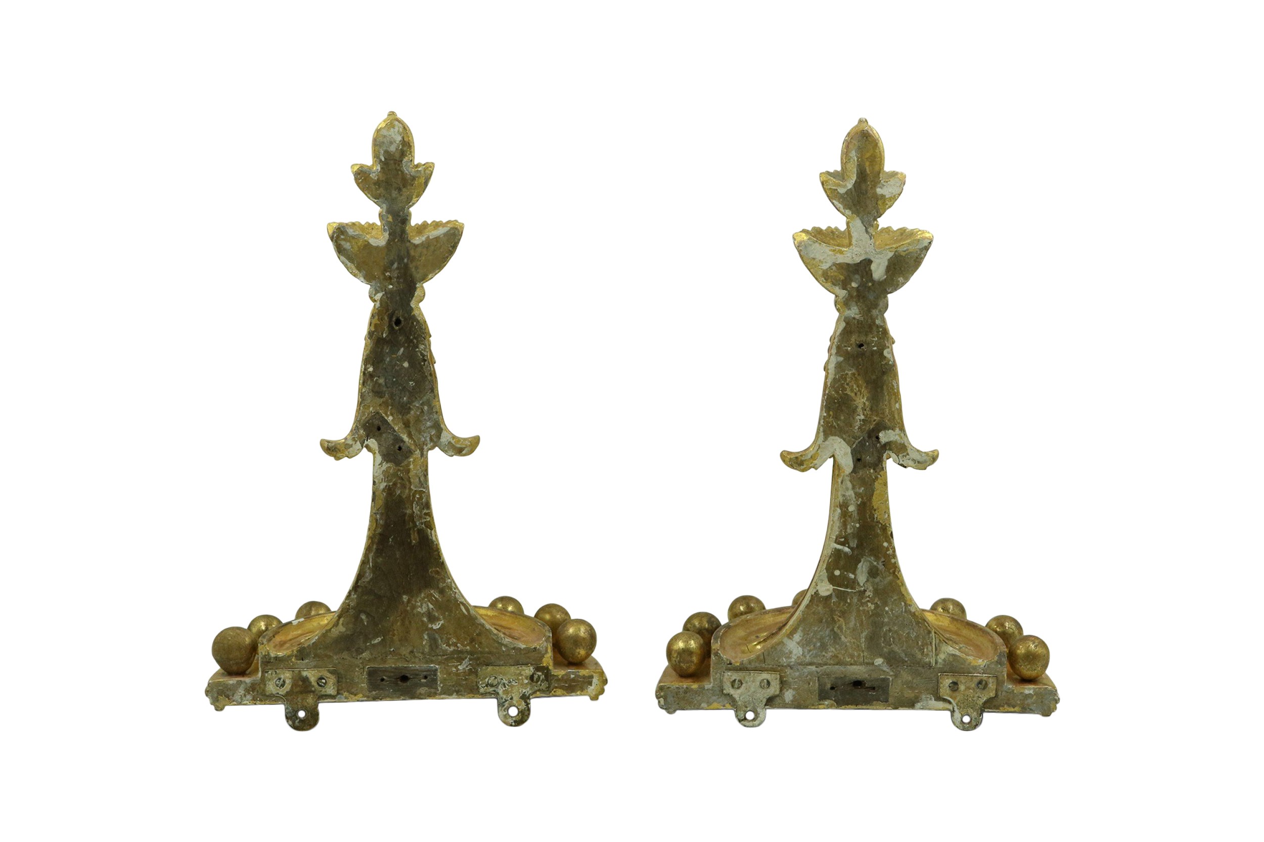 PAIR of Italian Neoclassic-style carved giltwood wall shelves with bundle of wheat design and carved balls below the semi-circular shelf surfaces. (PRICED AS PAIR)
