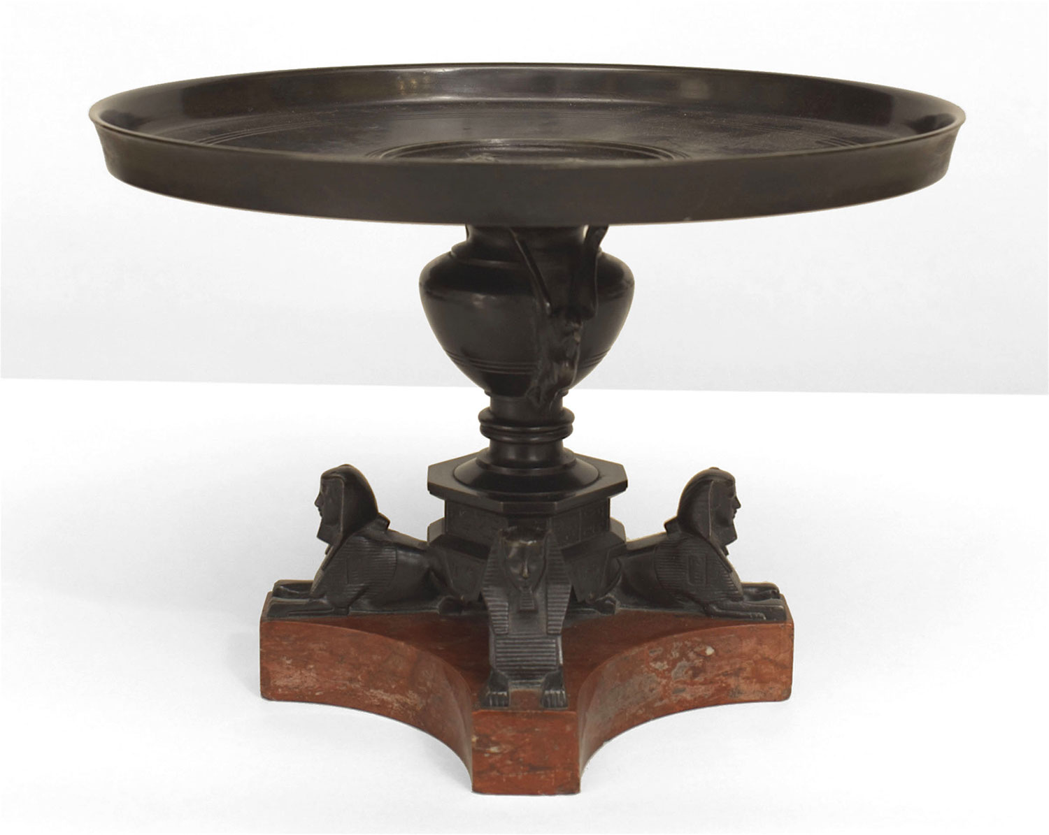 French Empire style (mid-19th Cent) "Grand Tour" bronze tazza resting on 4 sphinx figures over a griotte rouge marble base (possibly made by Henri Picard)