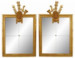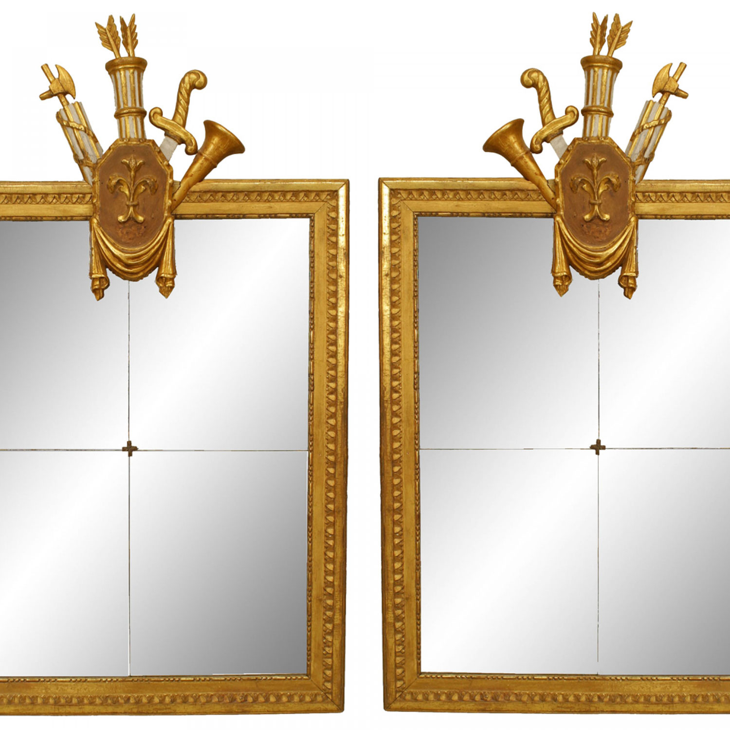 PAIR of Italian Neoclassic (18/19th Century) gilt framed wall mirrors with four glass panels and a white painted and gilt trophy carved pediment with a fleur-de-lis design. (PRICED AS PAIR).