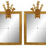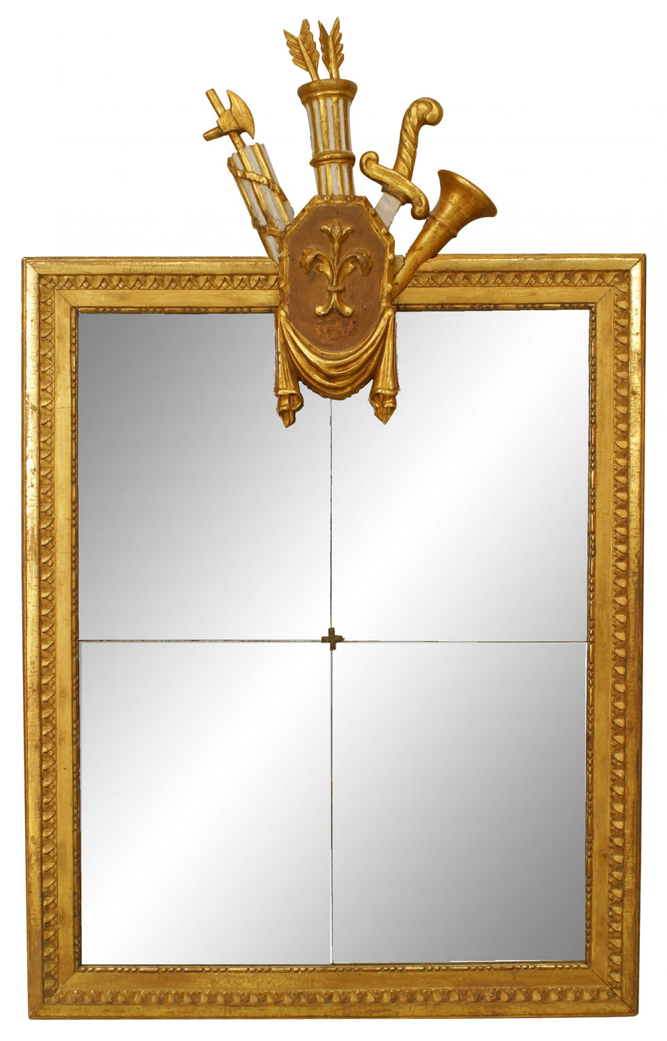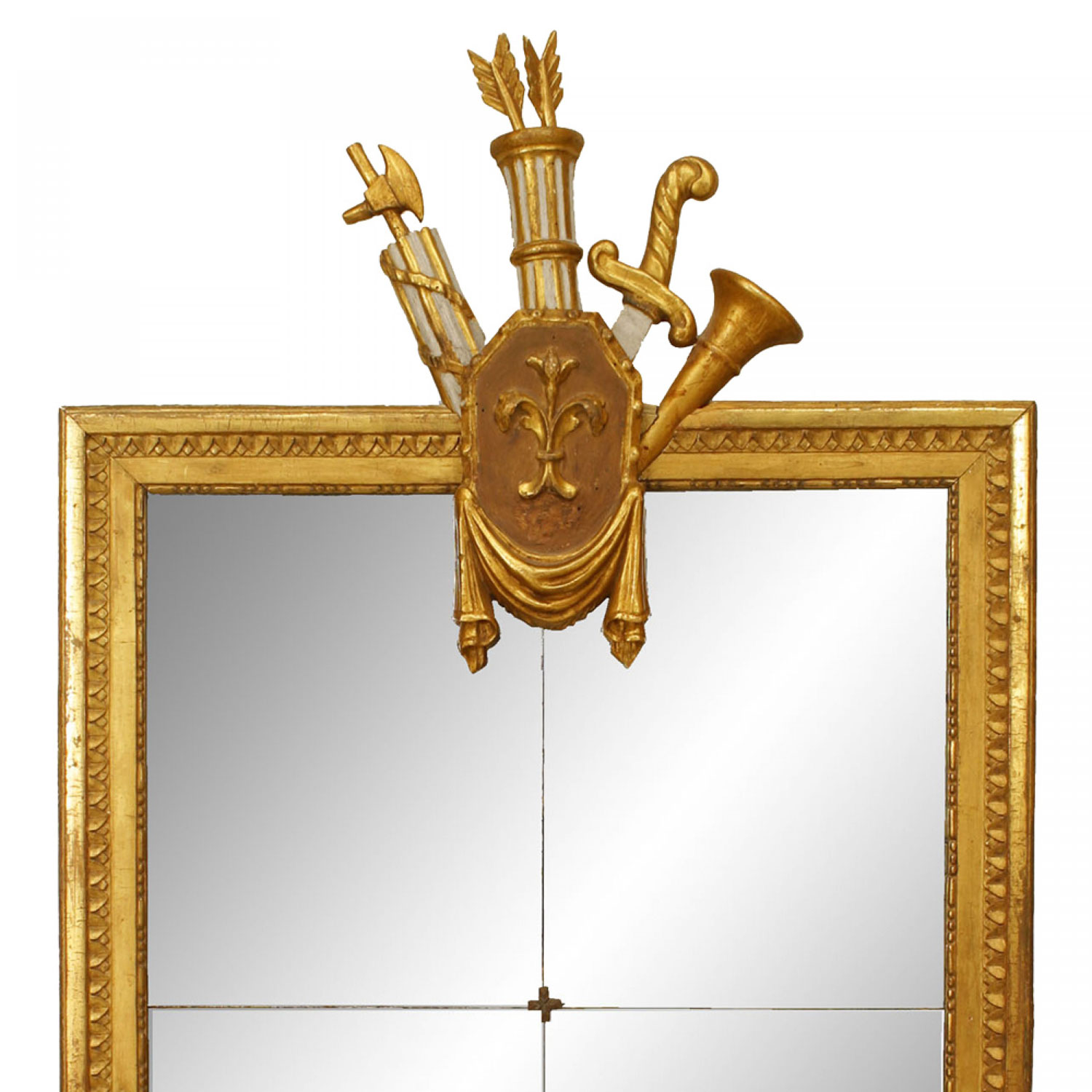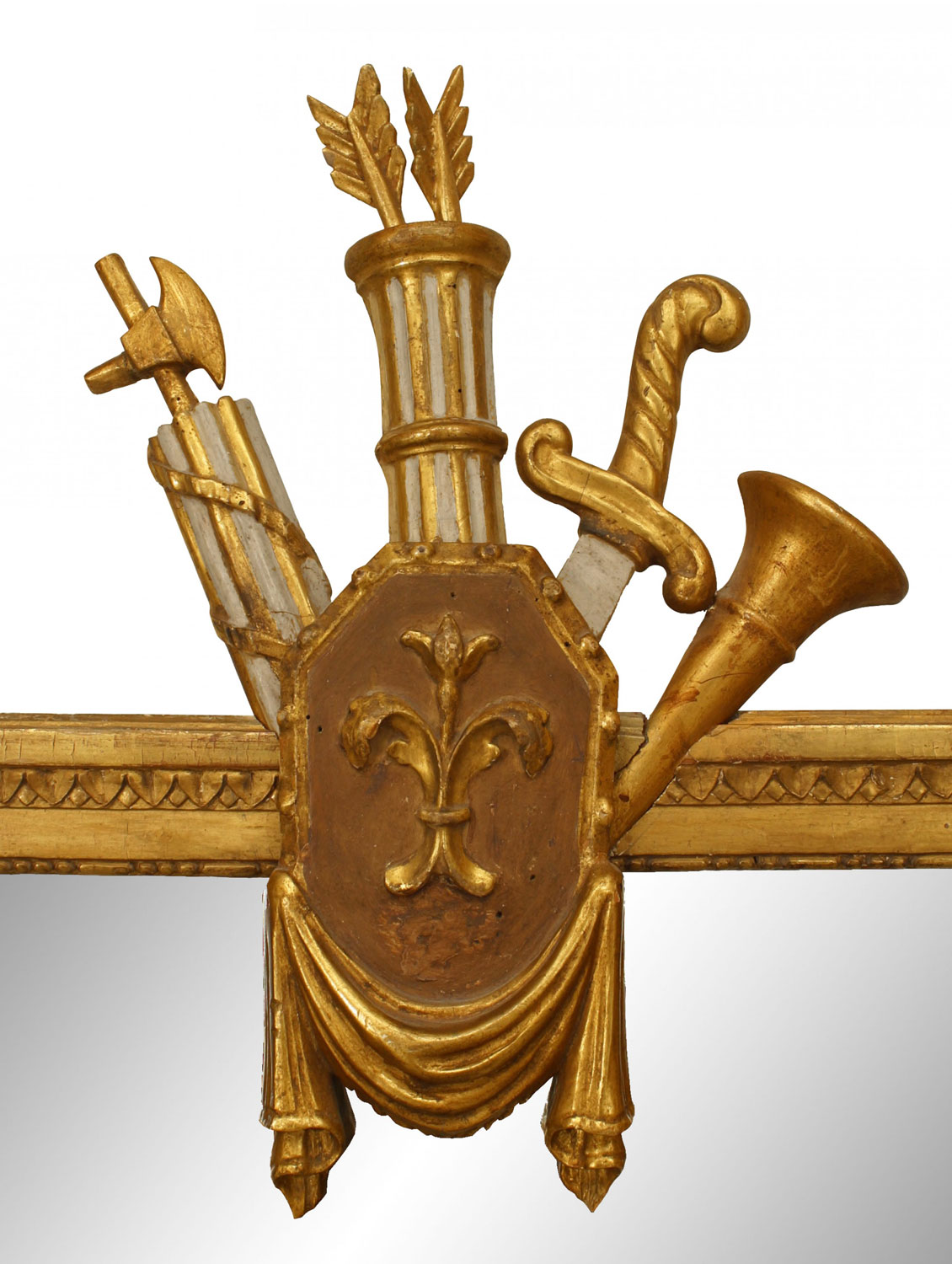 PAIR of Italian Neoclassic (18/19th Century) gilt framed wall mirrors with four glass panels and a white painted and gilt trophy carved pediment with a fleur-de-lis design. (PRICED AS PAIR)