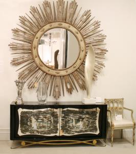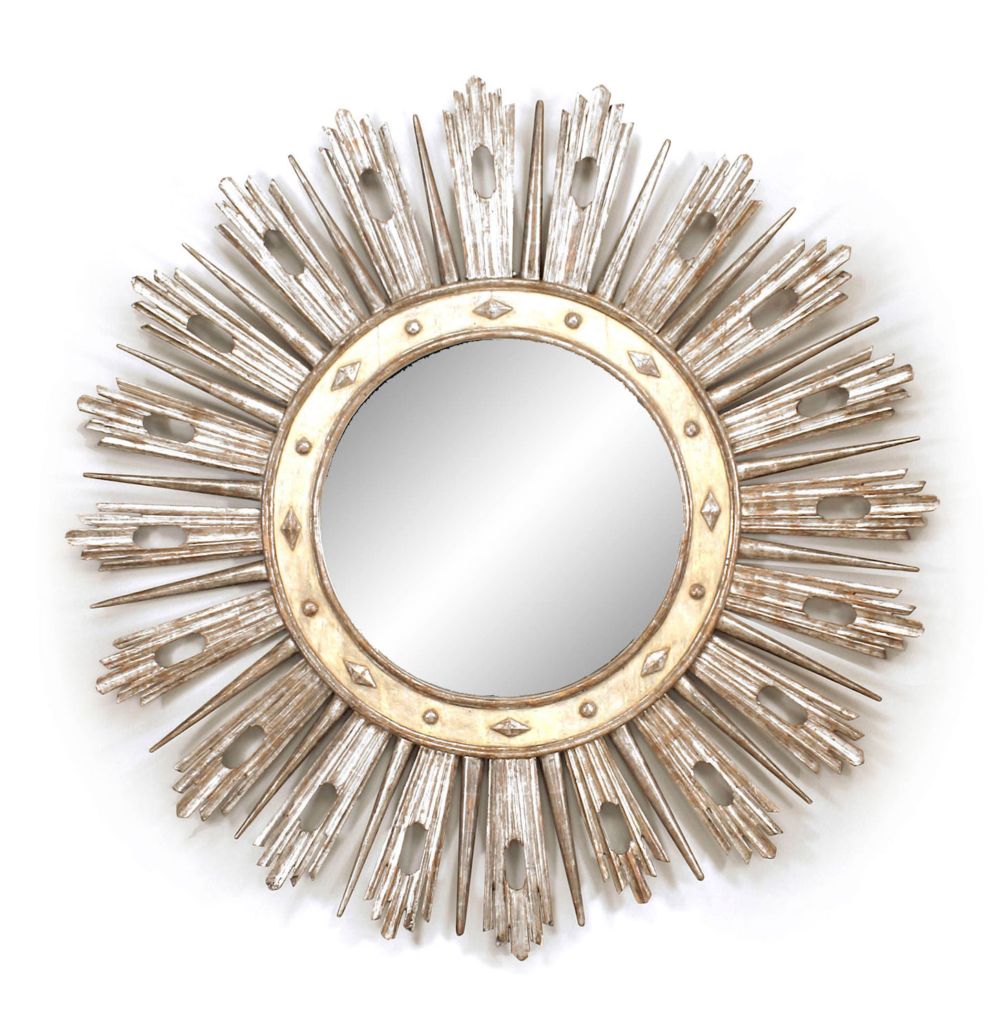 Italian Neoclassic (18/19th Century) monumental sunburst wall mirror with a gilt silvered varnish (Mecca) and cream painted detail. (Diameter of inner frame measures approximately 35").