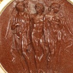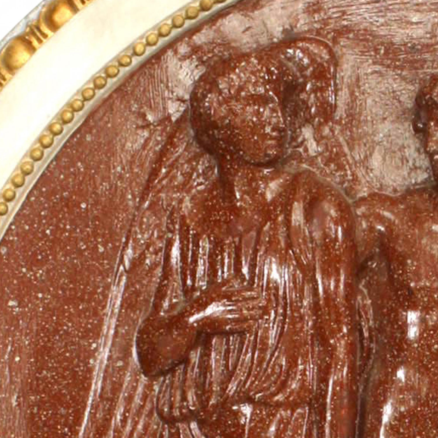 Italian Neo-classic style plaster wall plaque with painted faux porphyry scene of 3 figures within a white and gilt frame.
