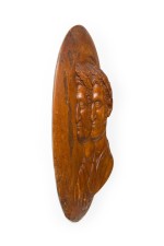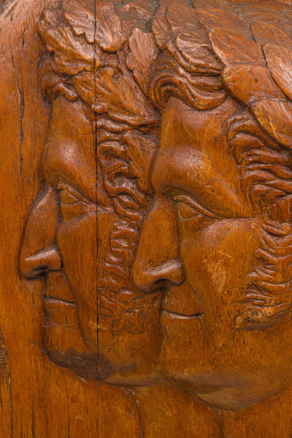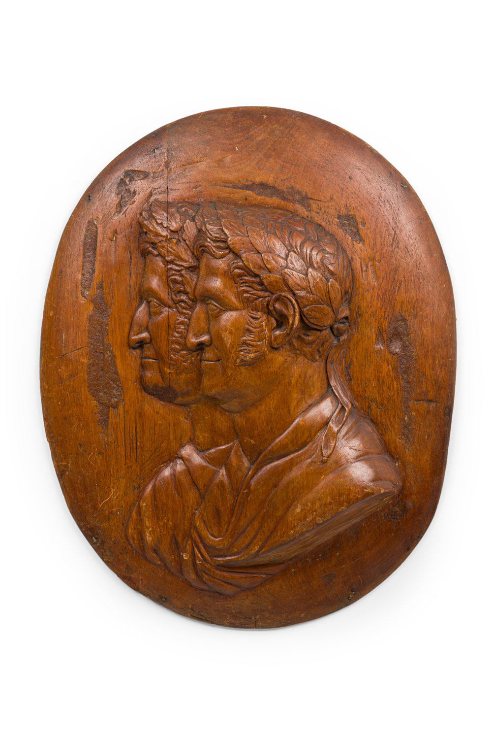 Italian Neoclassic style (19th Century) walnut oval wall plaque with 2 Roman Senators heads in relief..