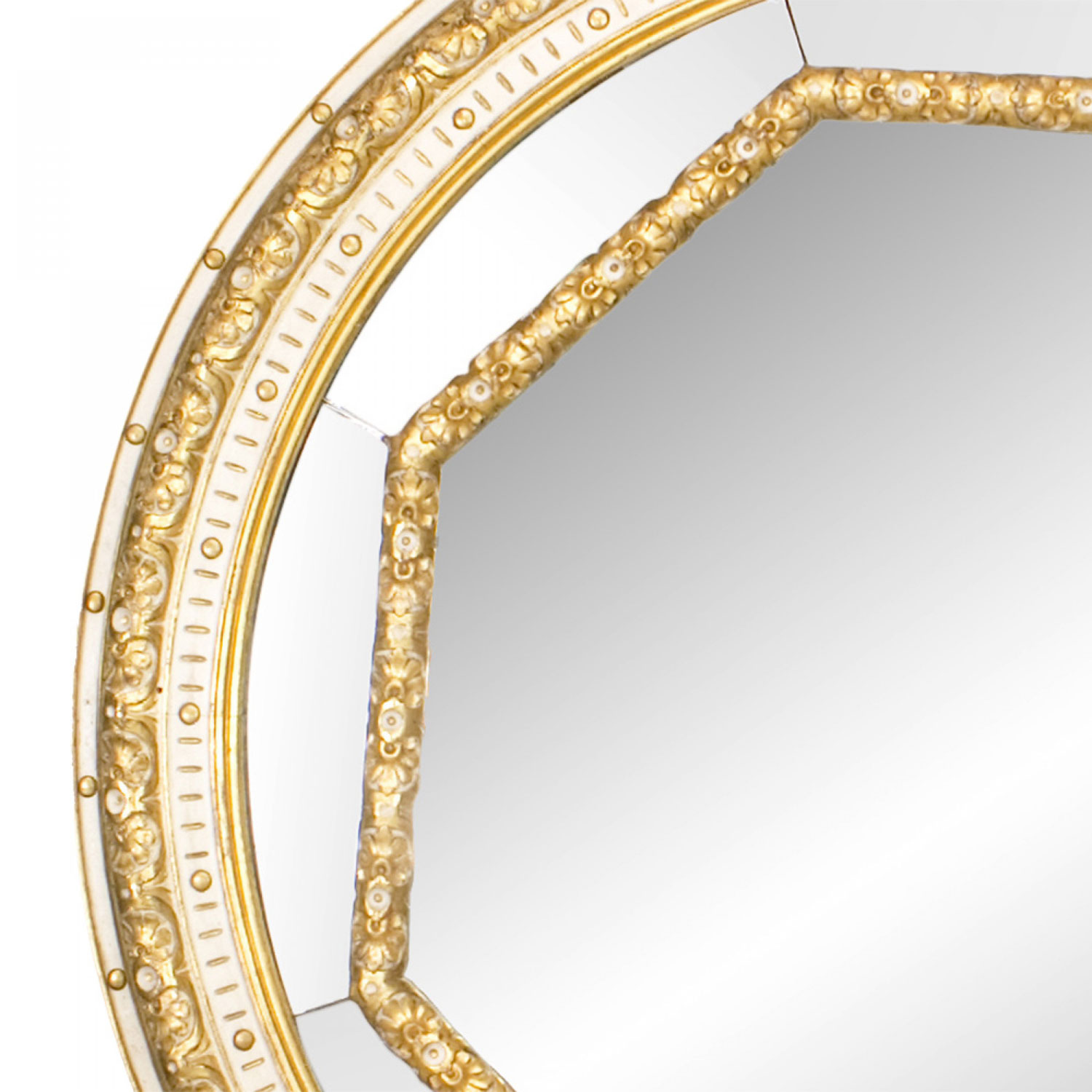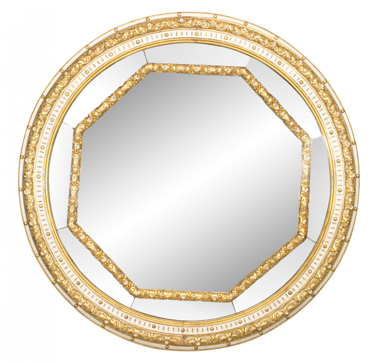 PAIR of Italian Neoclassic-style (19th Century) monumental round wall mirrors with a white painted and gilt trimmed finish and an octagonal inset frame. (PRICED AS PAIR).