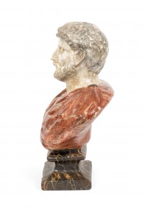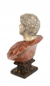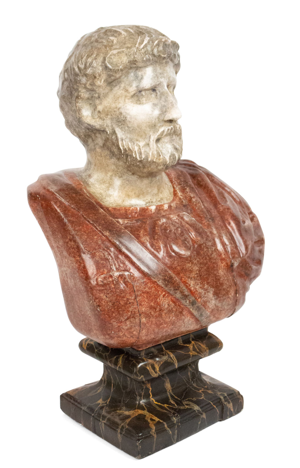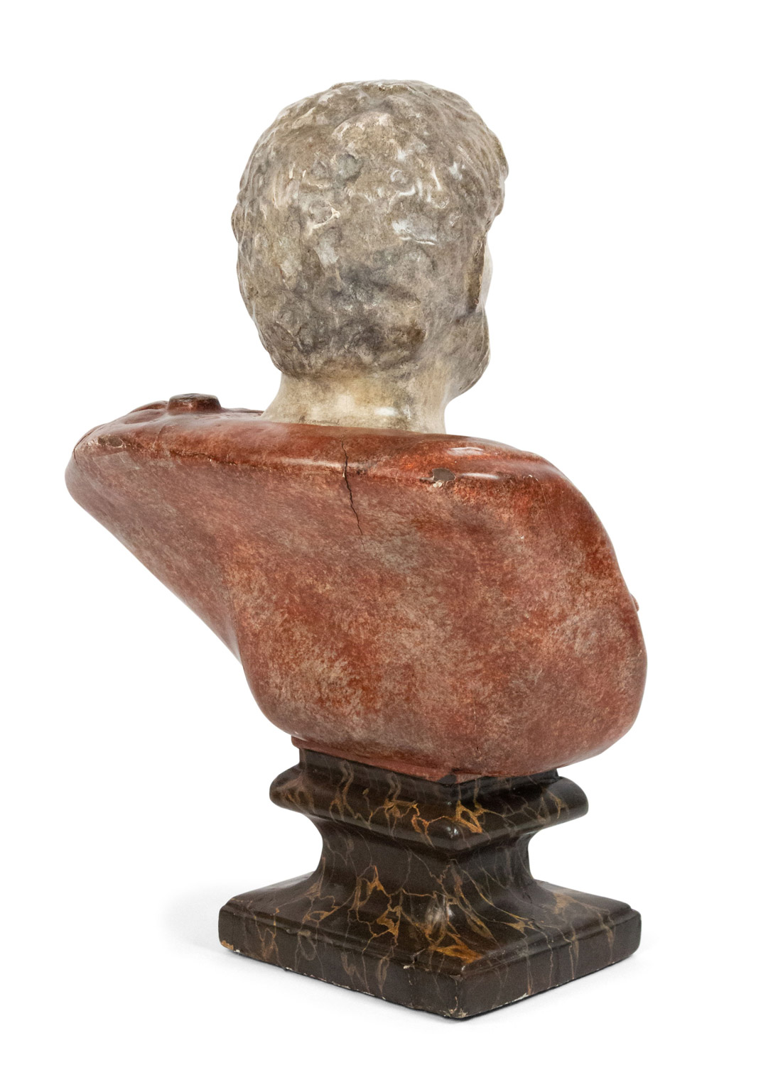 Italian Neo-Classic style (19/20th Cent) faux painted composition bust of a Roman Emperor wearing a red toga and mounted on a black square base.
