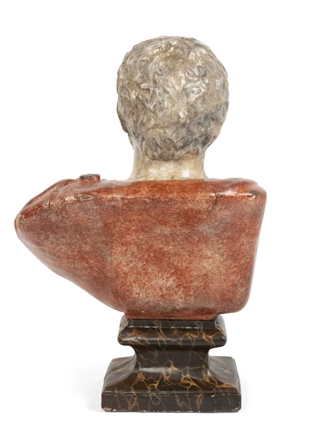 Italian Neo-Classic style (19/20th Cent) faux painted composition bust of a Roman Emperor wearing a red toga and mounted on a black square base..