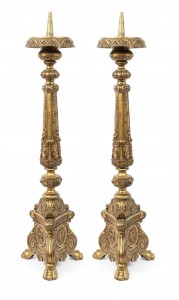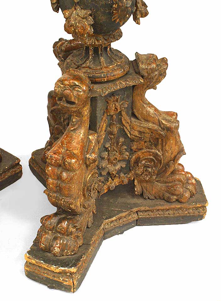 PAIR of Italian Renaissance-style (17th Century) dark green painted large floor standing altar style candlesticks with gilt carved floral and vine trim supported on base with 3 griffins (PRICED AS PAIR)