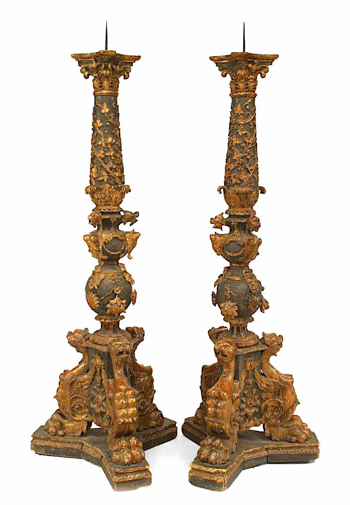 PAIR of Italian Renaissance-style (17th Century) dark green painted large floor standing altar style candlesticks with gilt carved floral and vine trim supported on base with 3 griffins (PRICED AS PAIR).