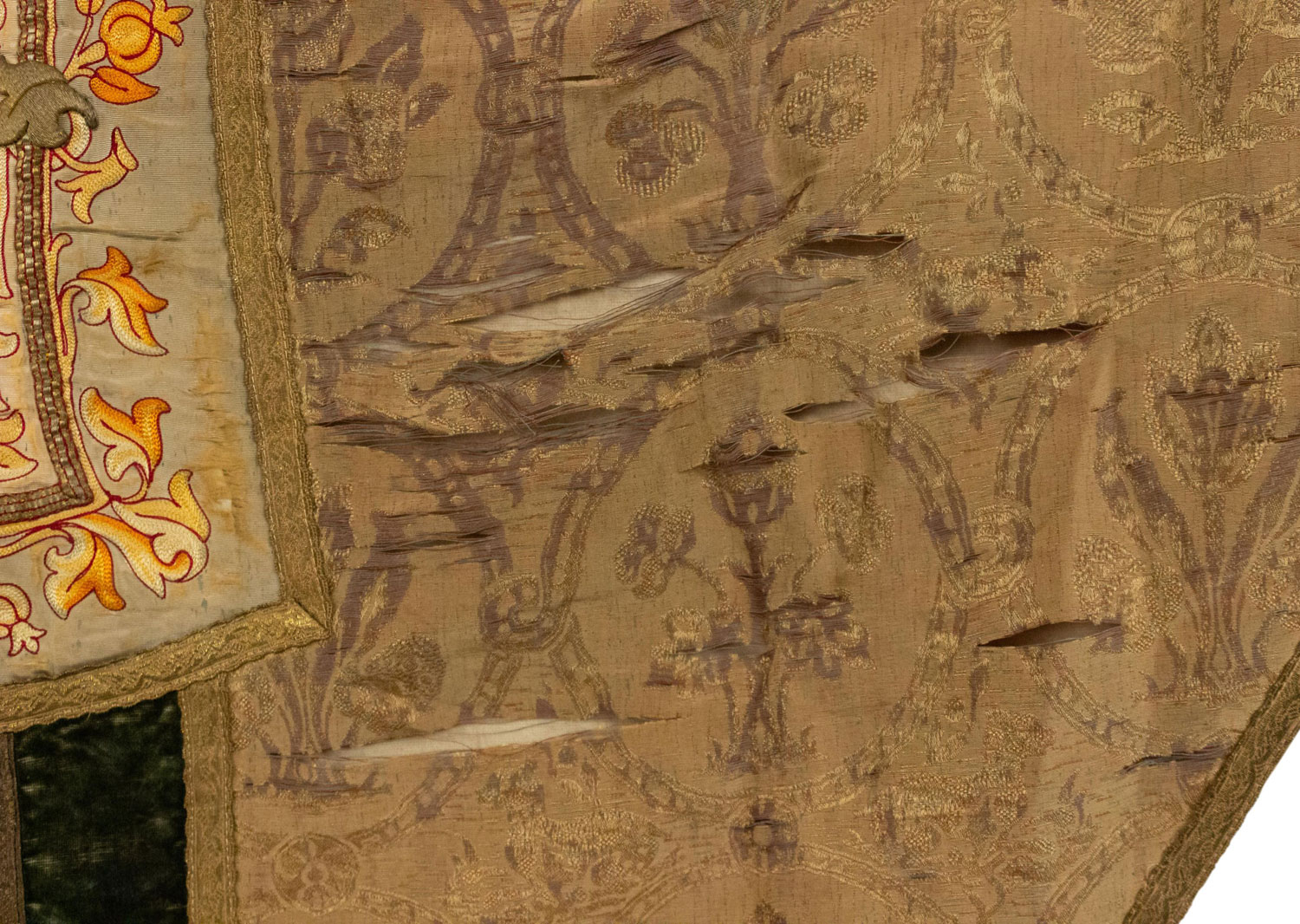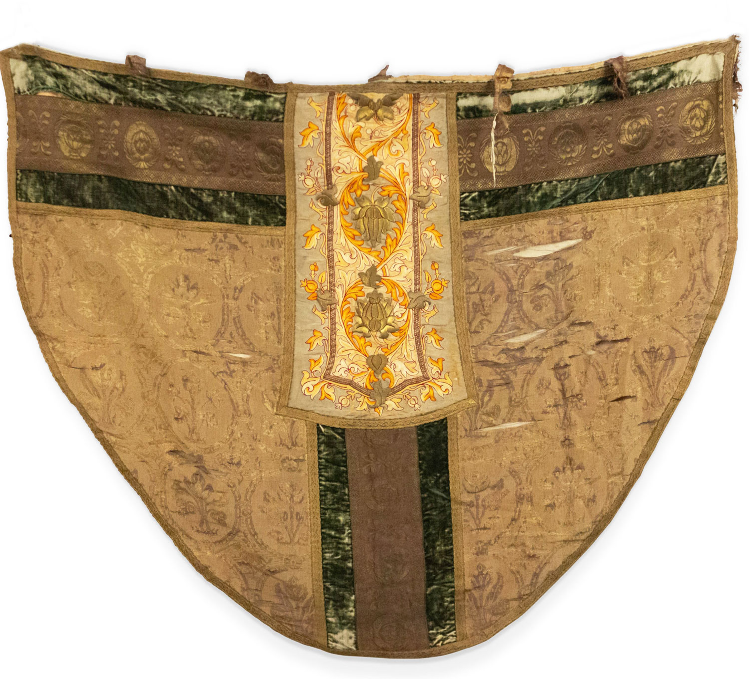 Italian Renaissance style (19th Century) beige and green shield shaped hanging banner with velvet trim..