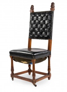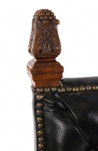 SET of 4 Italian Renaissance style oak high backed side chairs with black tufted leather backs & seats on porcelain casters (casters sgnd: R.Comb/Goodyear/1851)