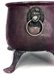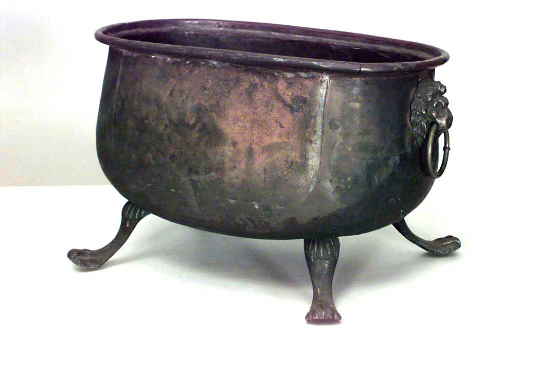 Italian Renaissance-style (19/20th Century) oval shaped brass jardiniere with lion side handles on four legs.