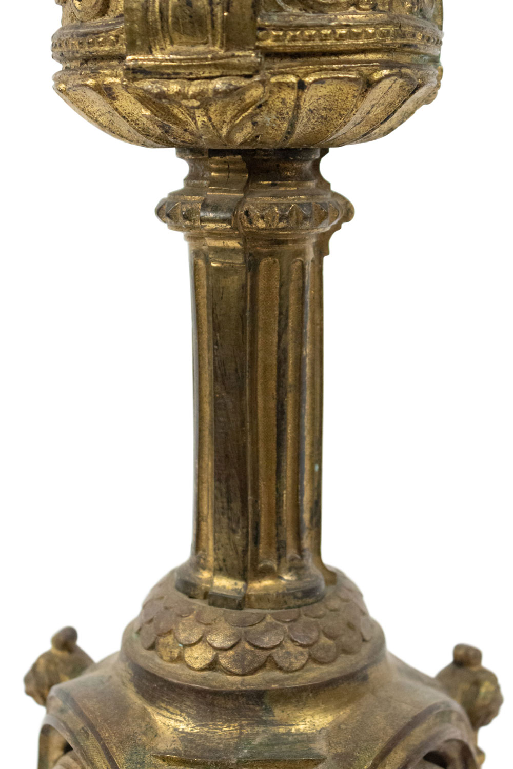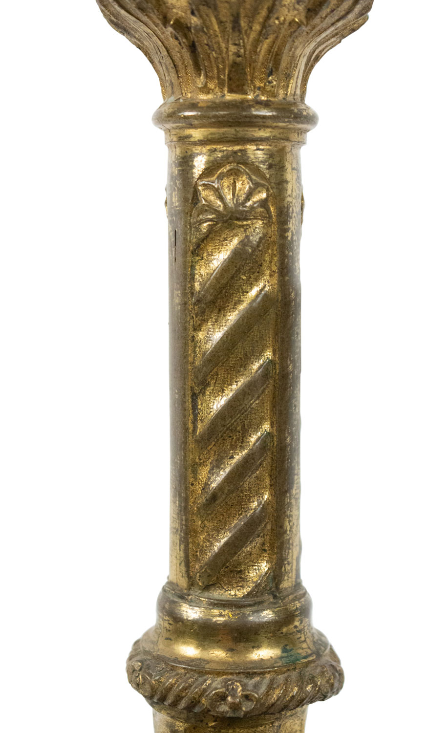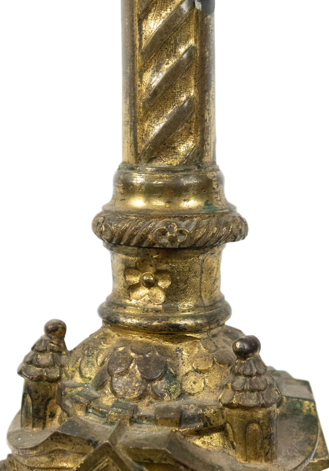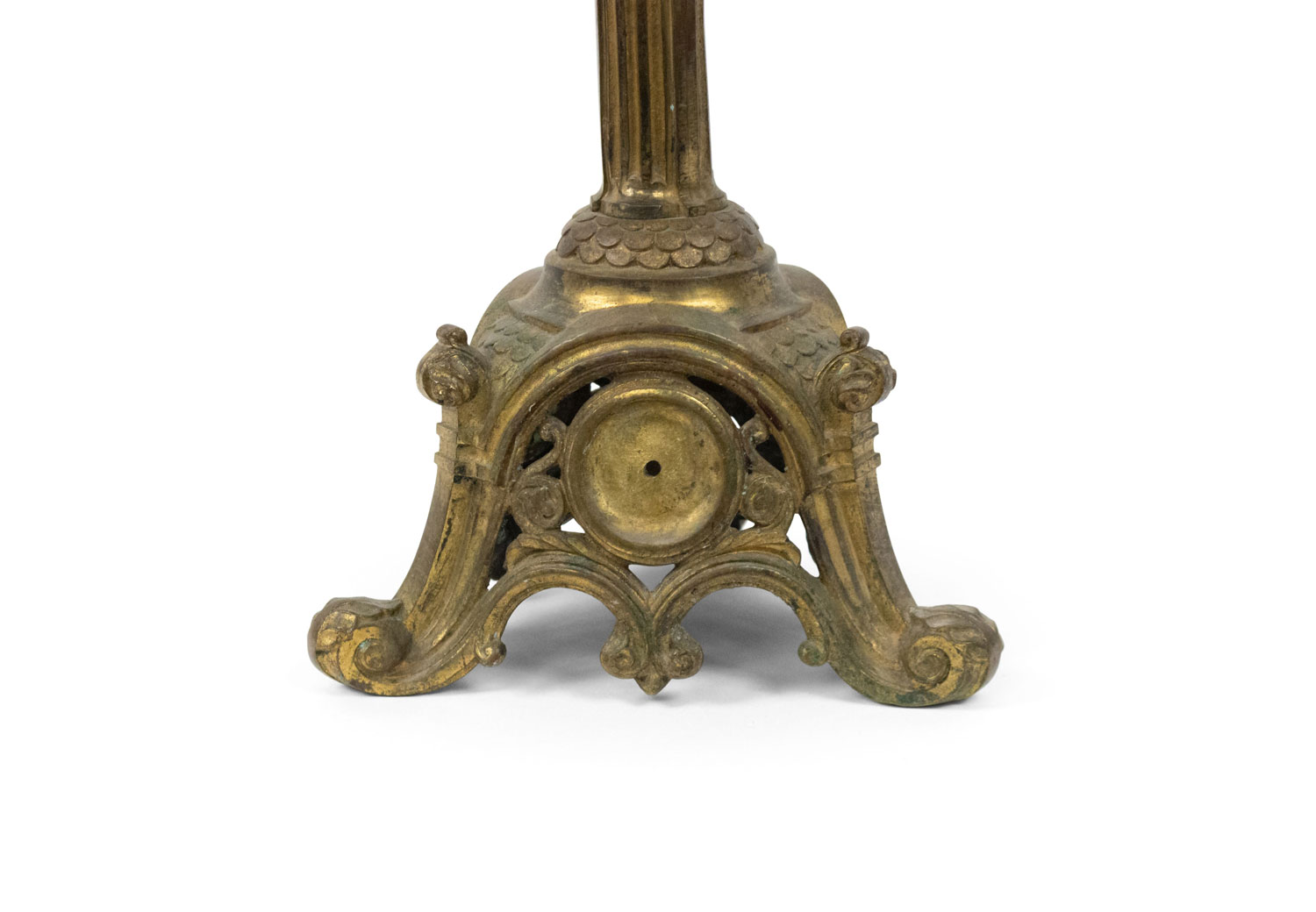 PAIR of Italian Renaissance-style (19th Century) bronze altar sticks with swirl top and fluted bottom with round center and scroll filigree base (PRICED AS PAIR)