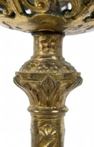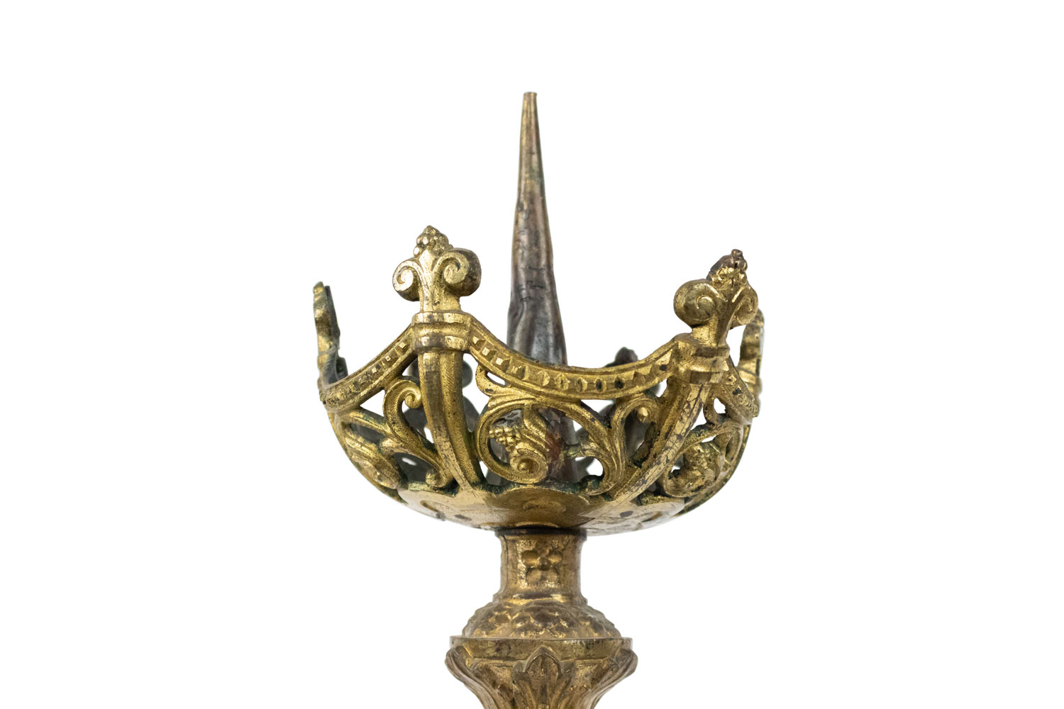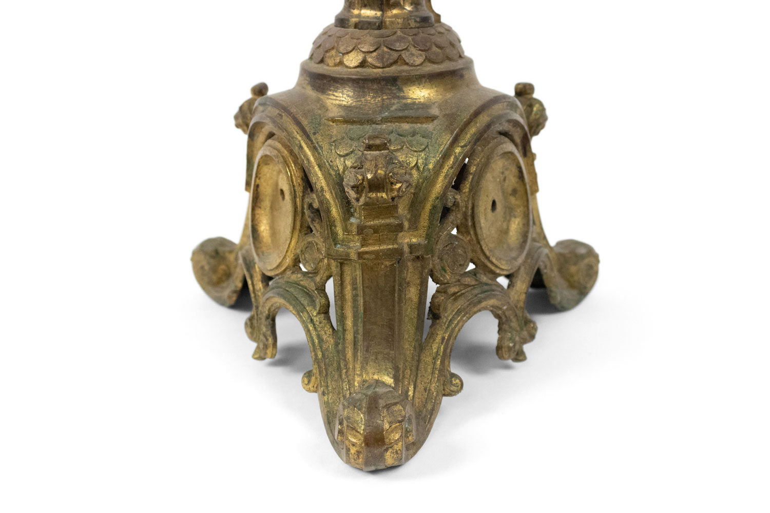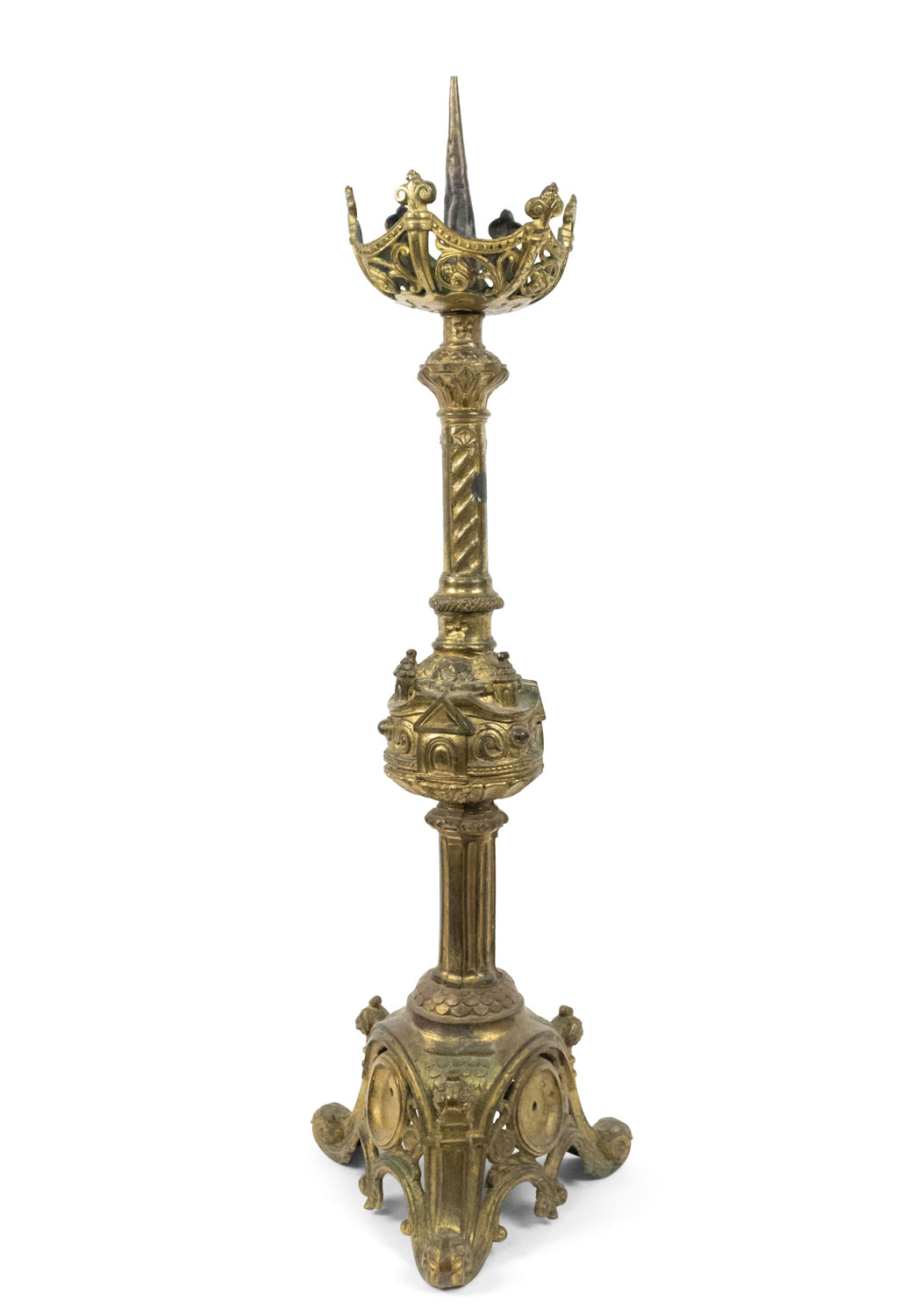 PAIR of Italian Renaissance-style (19th Century) bronze altar sticks with swirl top and fluted bottom with round center and scroll filigree base (PRICED AS PAIR)