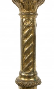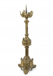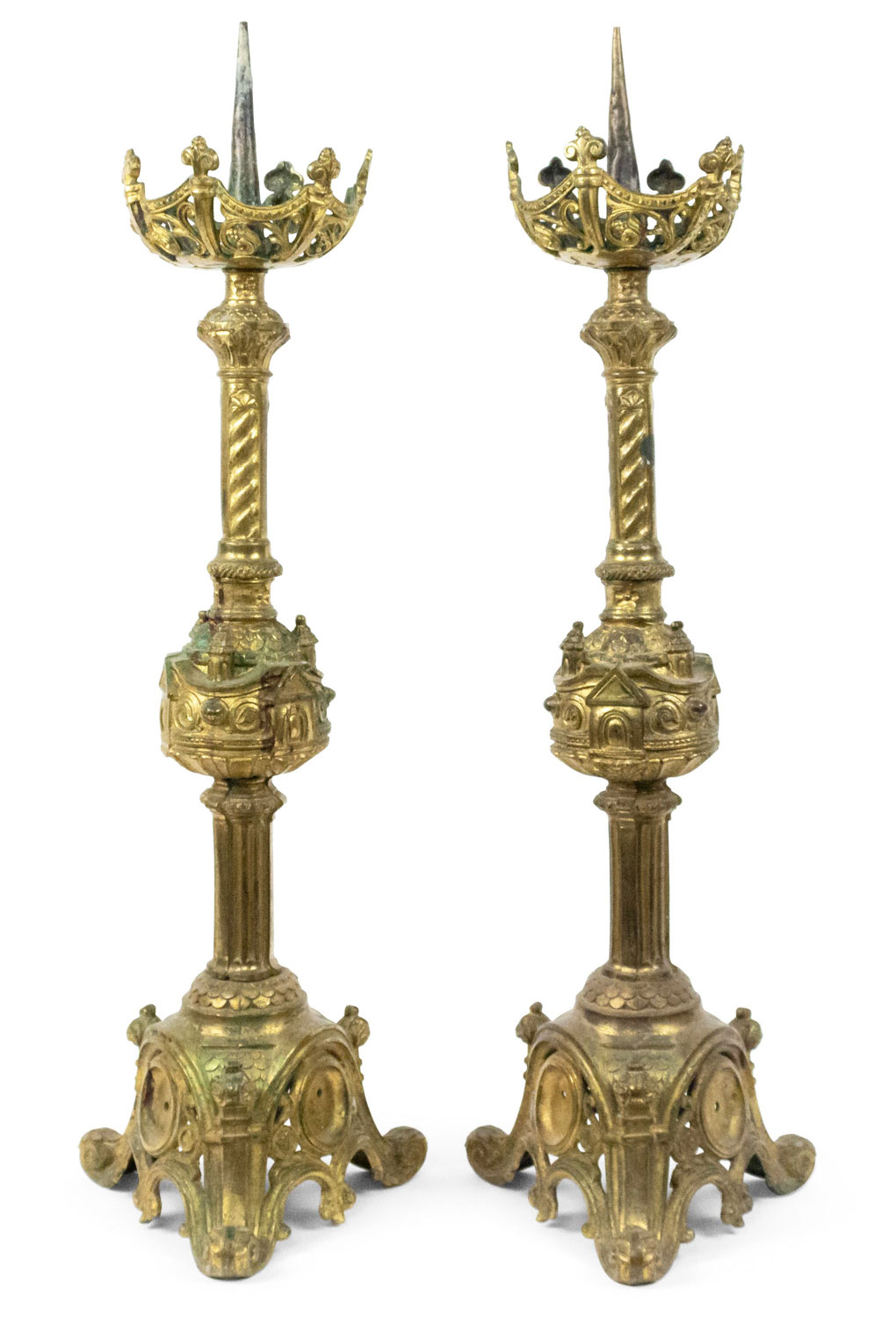 PAIR of Italian Renaissance-style (19th Century) bronze altar sticks with swirl top and fluted bottom with round center and scroll filigree base (PRICED AS PAIR).
