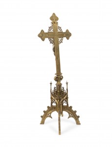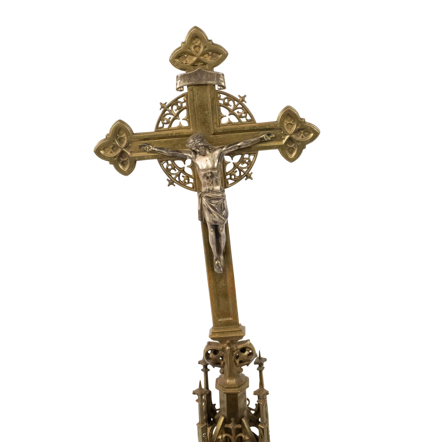 Italian Renaissance Gothic style (19th Cent) bronze religious crucifix with filigree cross on 4 legged base with silver plate Christ figure (19th Cent.).