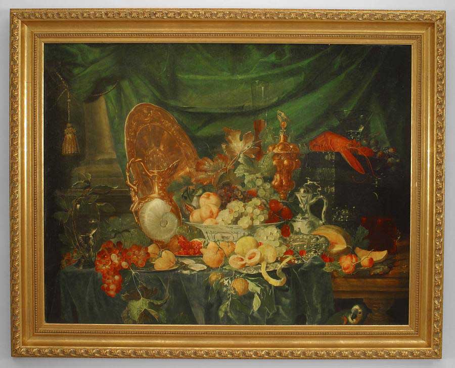 Italian Renaissance style still life of fruit with gold serving pieces displayed in front of a green drape in a gilt carved frame