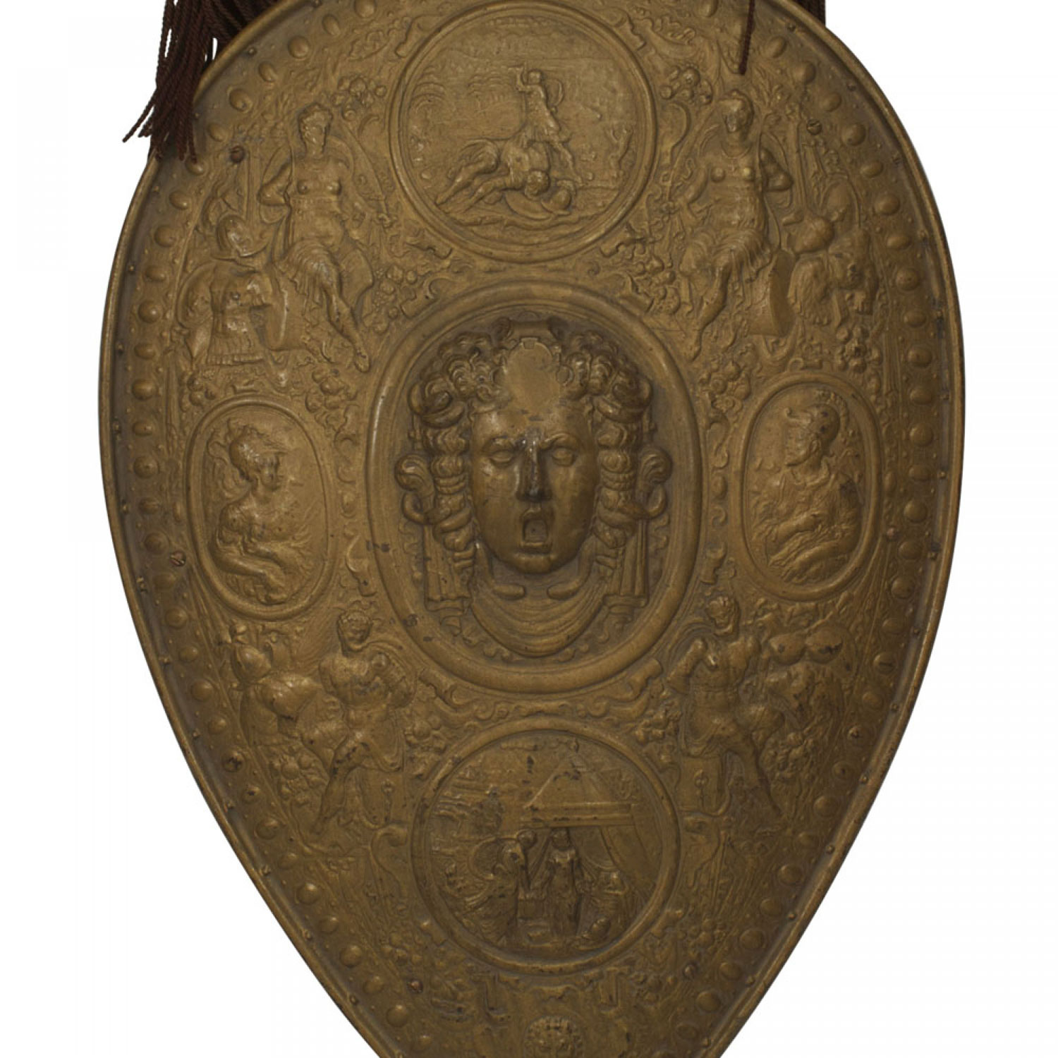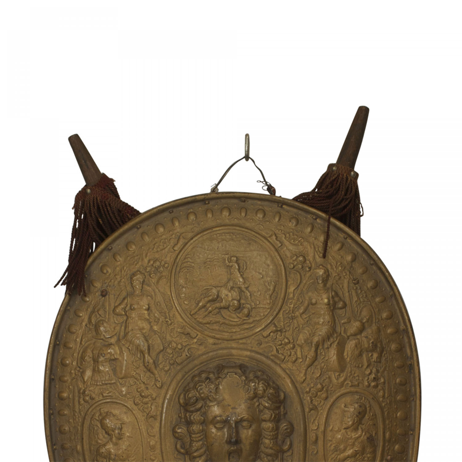 Italian Renaissance-style (19th/20th Century) gold painted metal shield with classic head center surrounded by Renaissance figures.