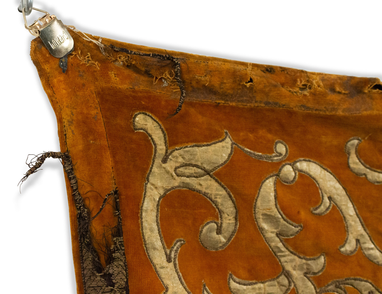 Italian Renaissance style (19/20th Century) gold velvet hanging banner with damask and embroidered curved bottom.