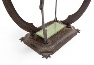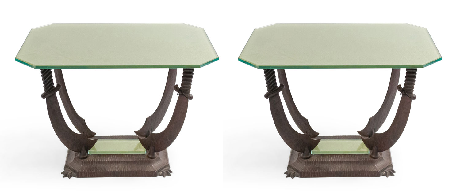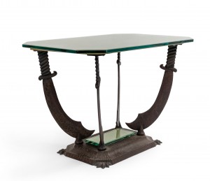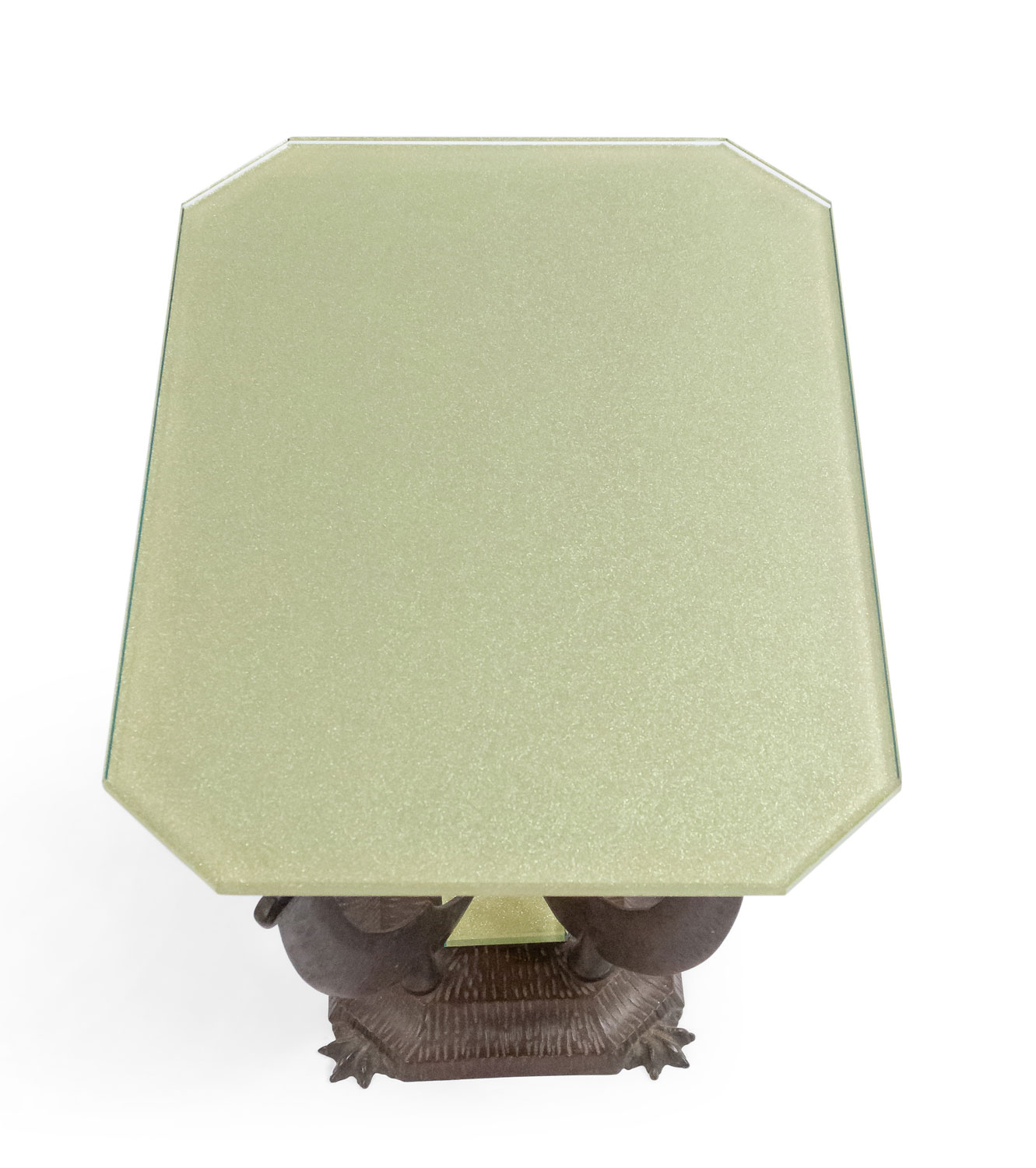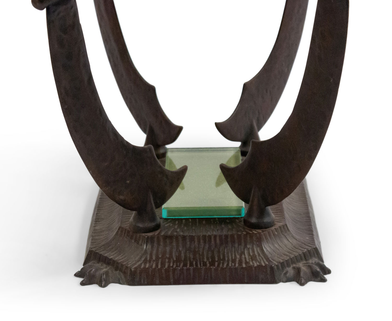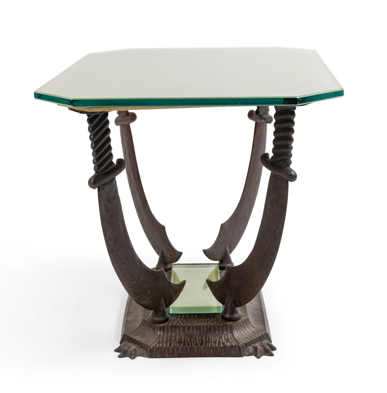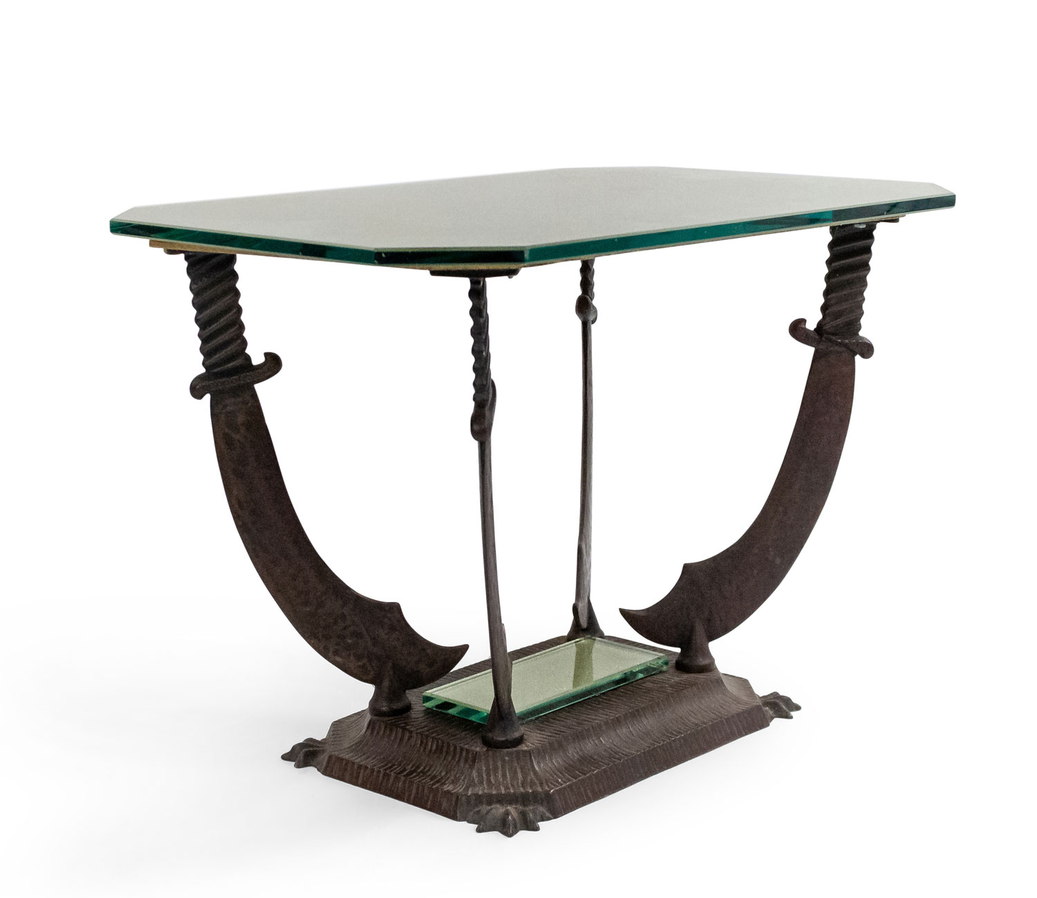 PAIR of Italian Renaissance-style (1st Quarter 20th Century) iron low end tables having a gold glass top supported on 4 sabers resting on a rectangular base