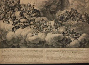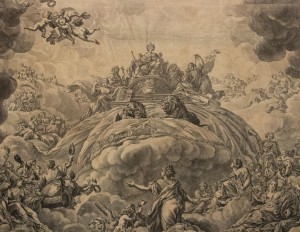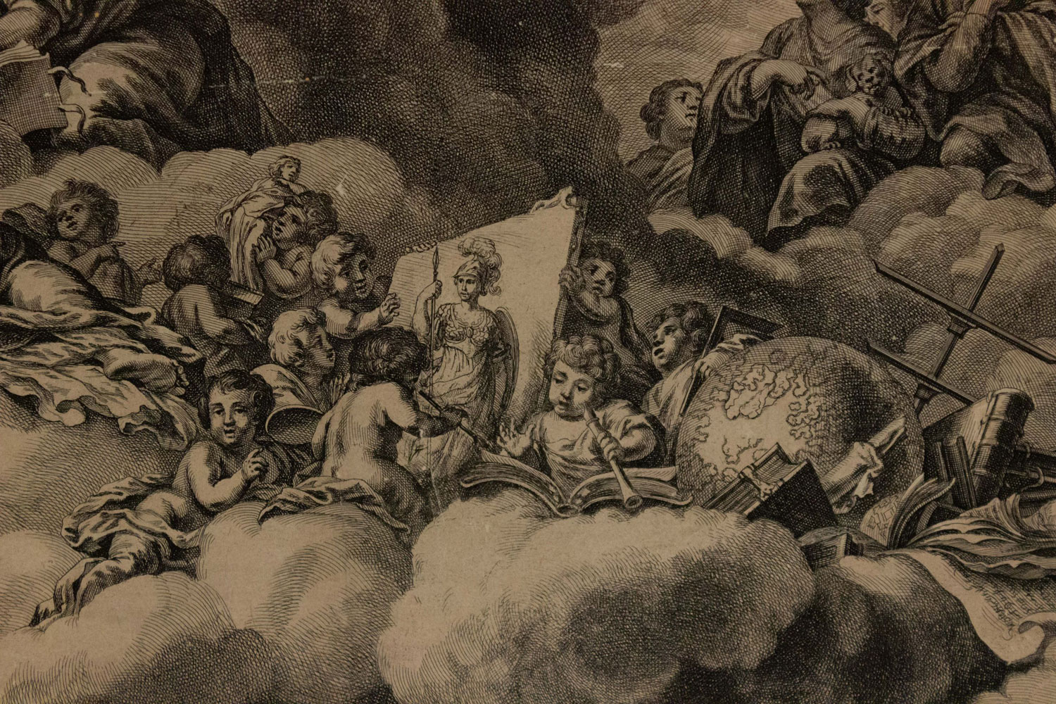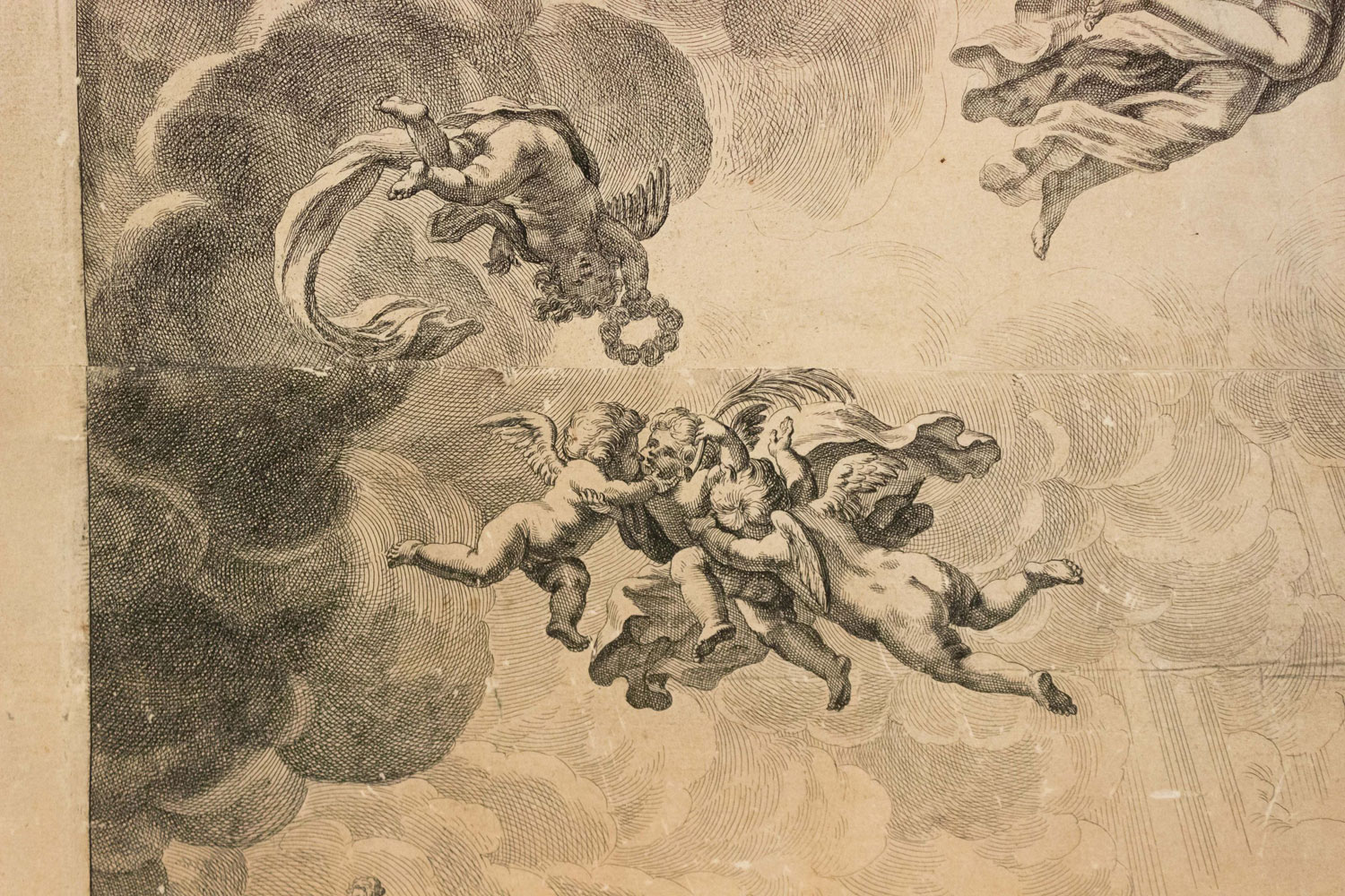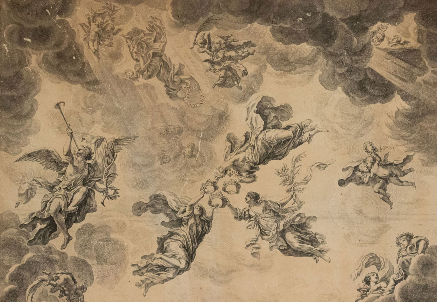 Italian Renaissance style black lacquer framed vertical lithograph of classical scene with angels.