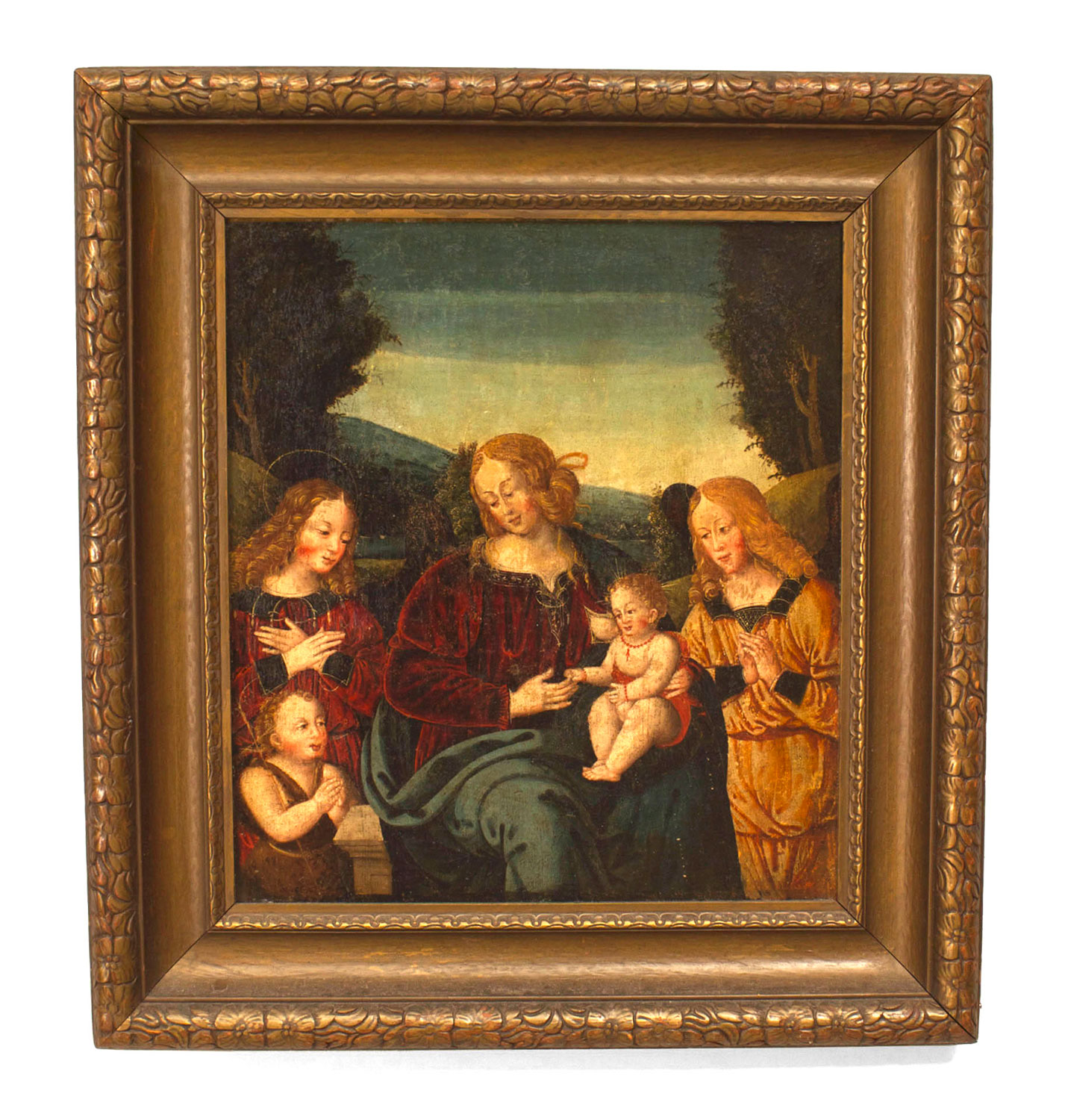 Italian Renaissance style (19th Cent) gilt framed oil painting of Madonna and child with 3 attendants.
