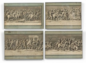 Set of 26 Italian Renaissance style 18th Century copperplate engravings of military procession in silver metal frames