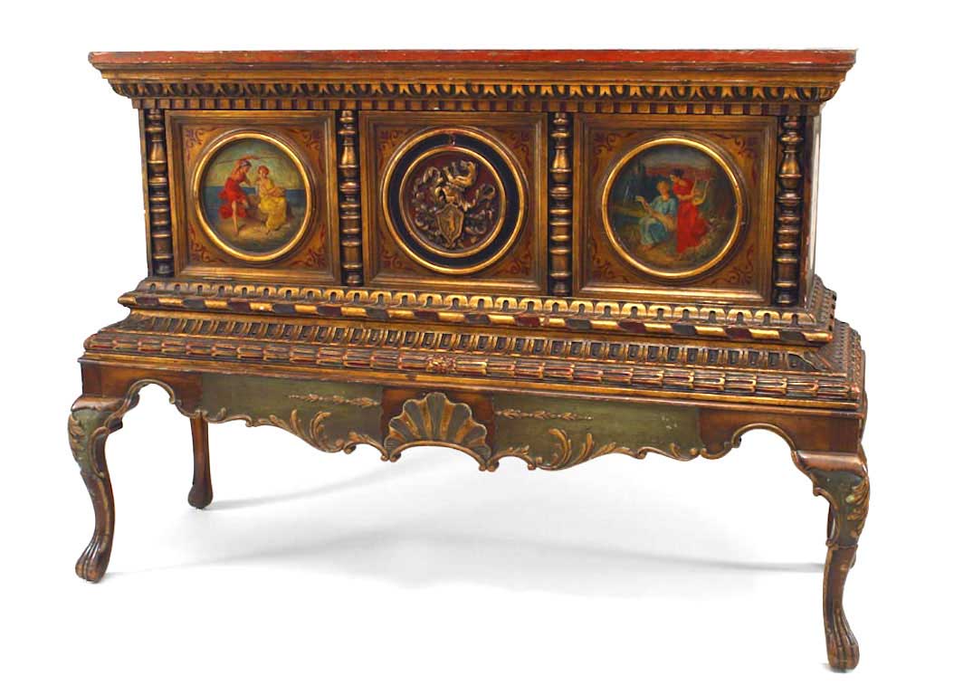 Italian Renaissance style (late 19th Century) polychromed and parcel gilt chest on a stand with round painted panels and faux marble top.
