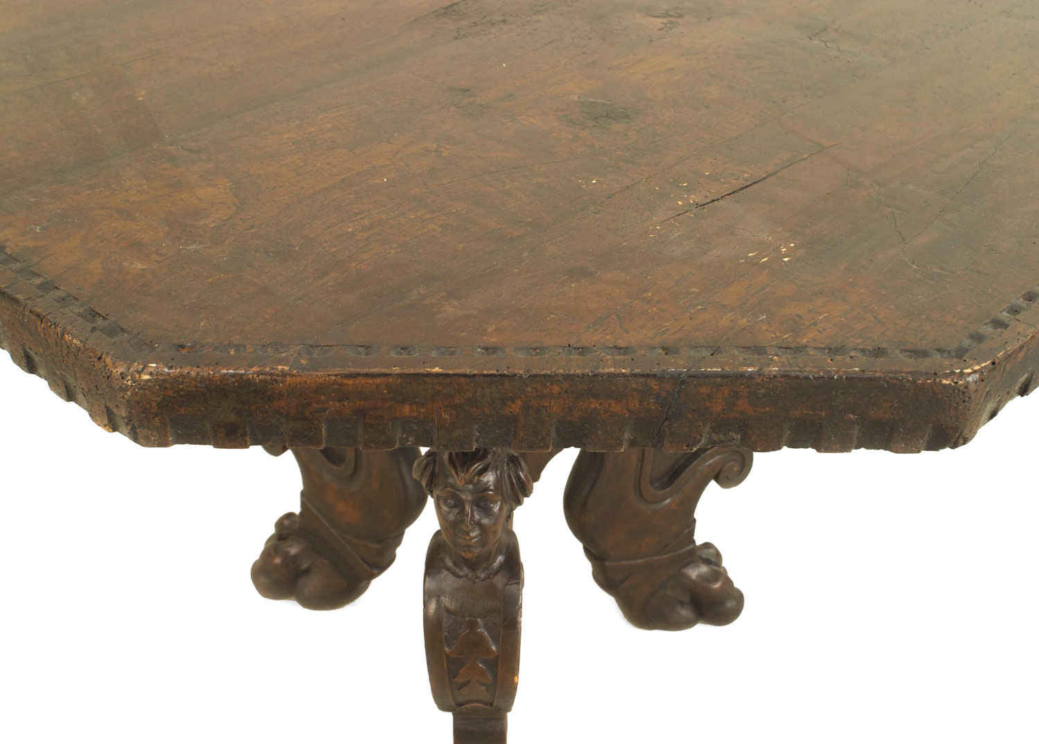 Italian Renaissance Revival (19th Century) walnut octagonal top center table with a carved edge and supported on a carved tripartite base with claw feet.