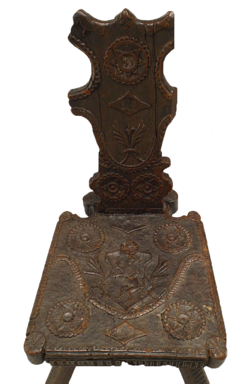 2 Similar Italian Renaissance style (17th Cent) walnut curved 3 legged sgabelli with carved back and seat (PRICED EACH).