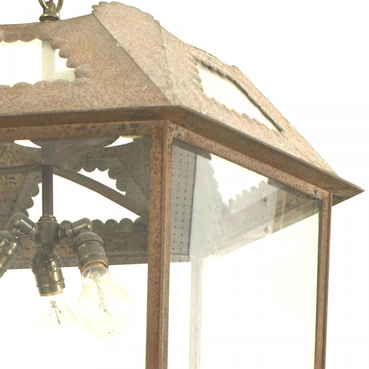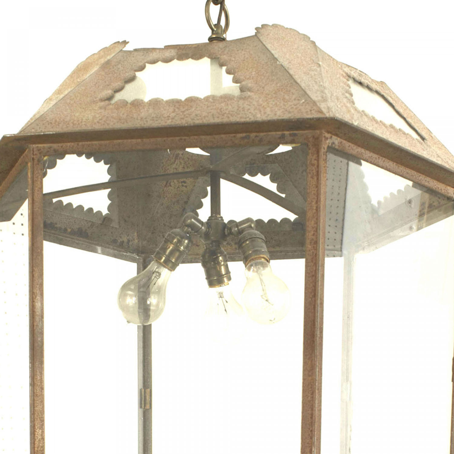 Italian Renaissance-style 6 sided glass lantern with an iron decorative top section..