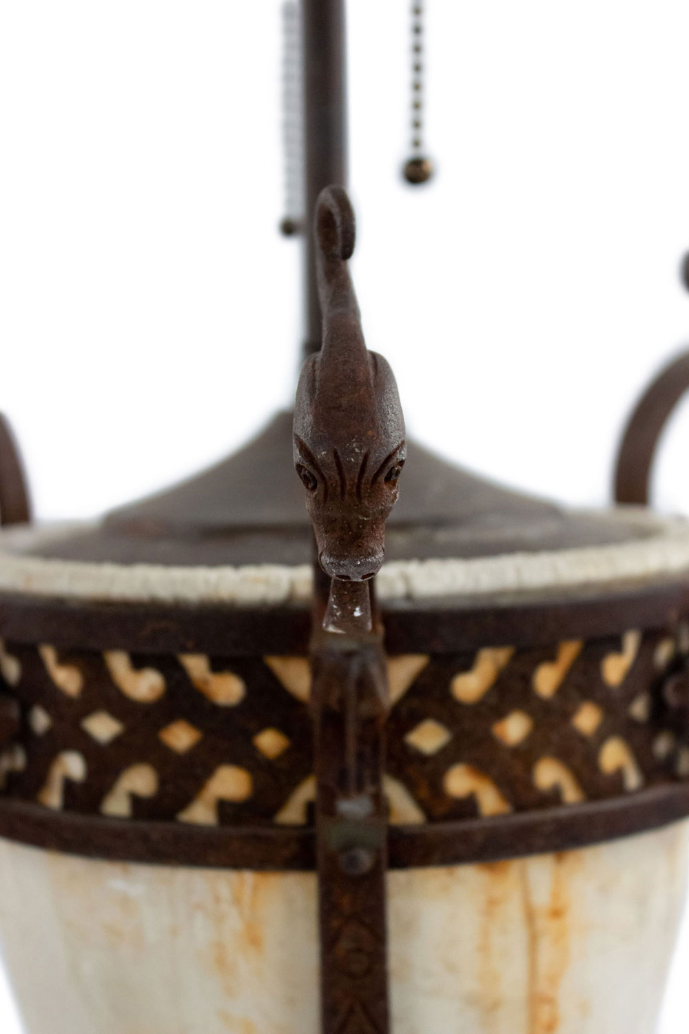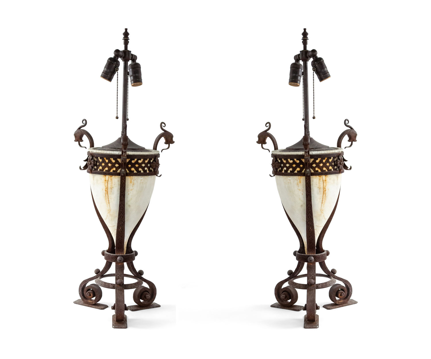 PAIR of Italian Renaissance style (19/20th Century) alabaster vase form lamps within a wrought iron 3 section frame with mythological finial heads and scroll feet (PRICED AS PAIR).