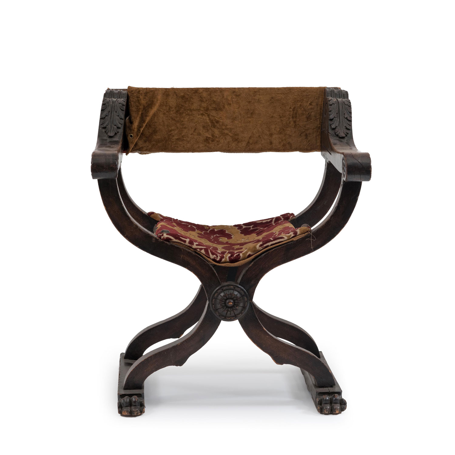Italian Renaissance Savanarola style walnut arm chair with red velvet upholstery and carved front (19th Cent).