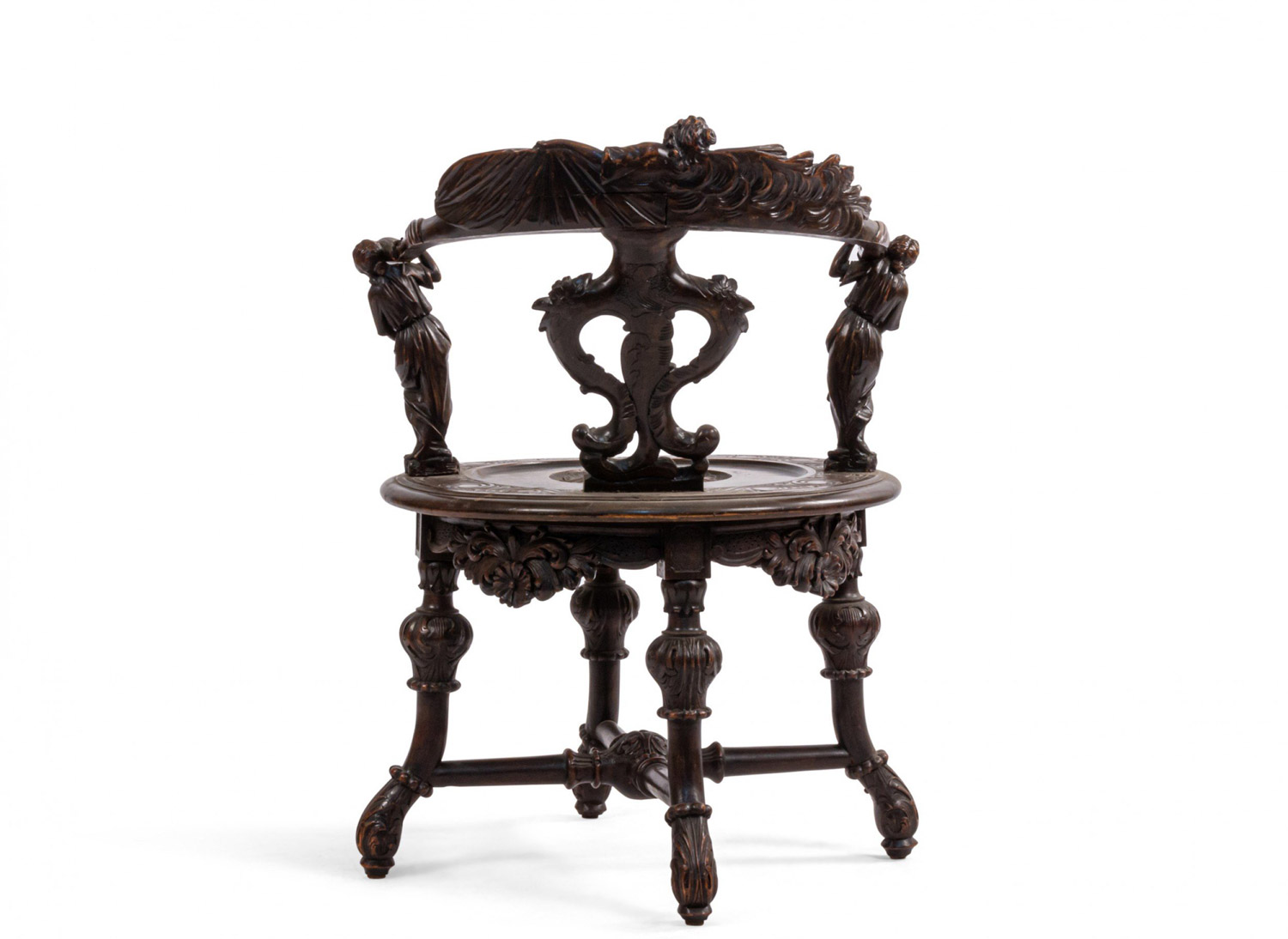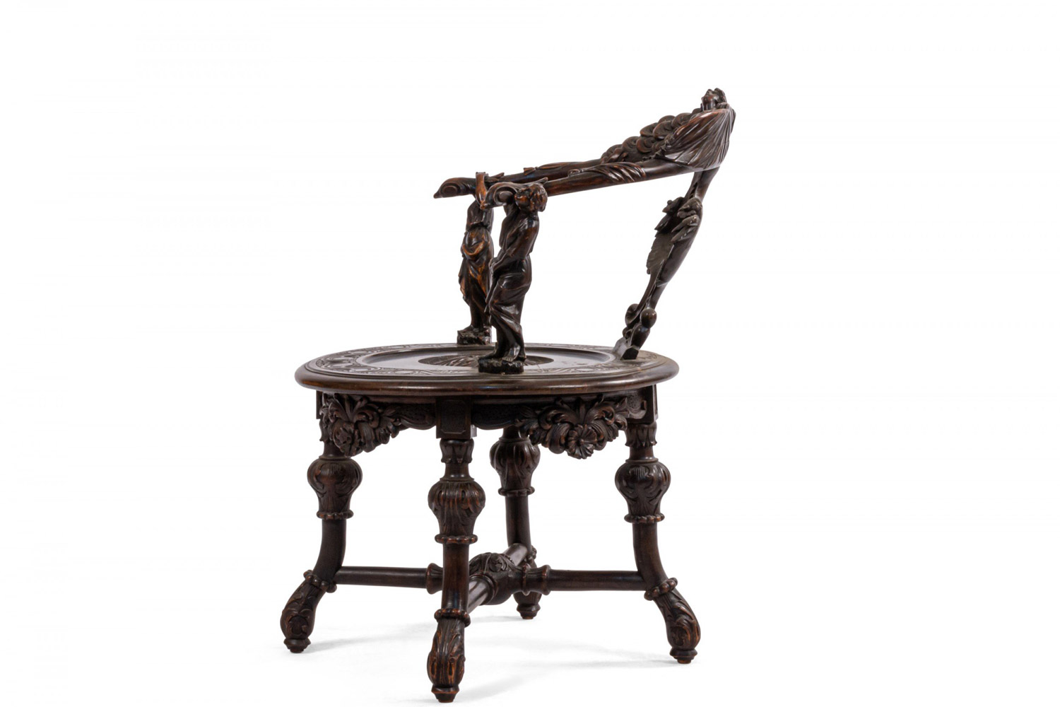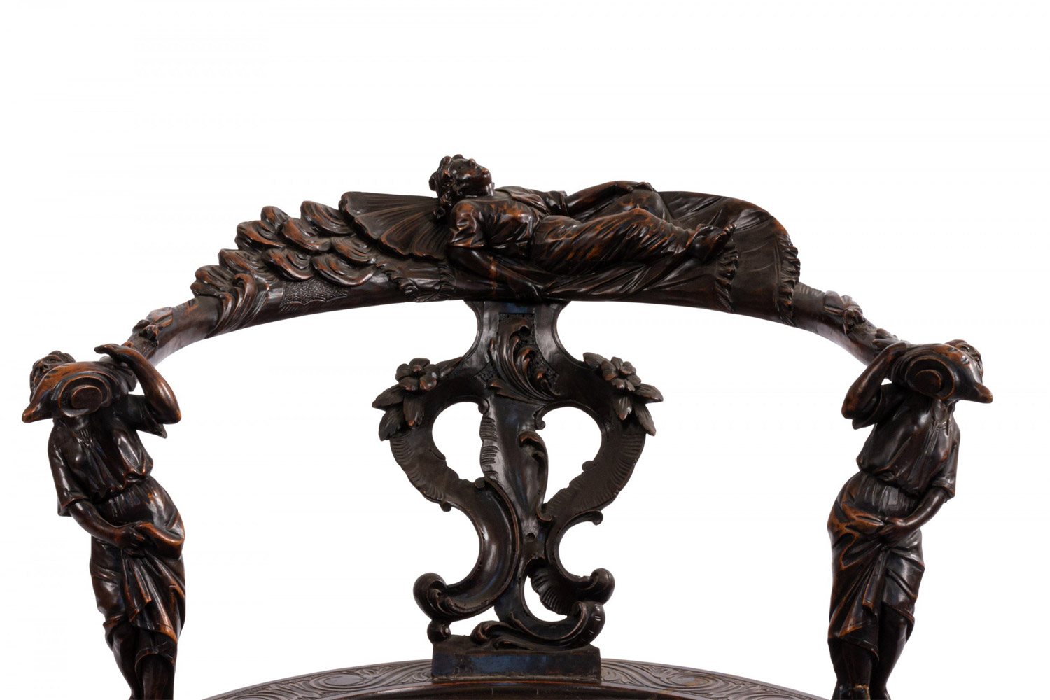 Italian Renaissance-style (19th Century) walnut armchair with carved round back and seat with reclining figures and stretcher..