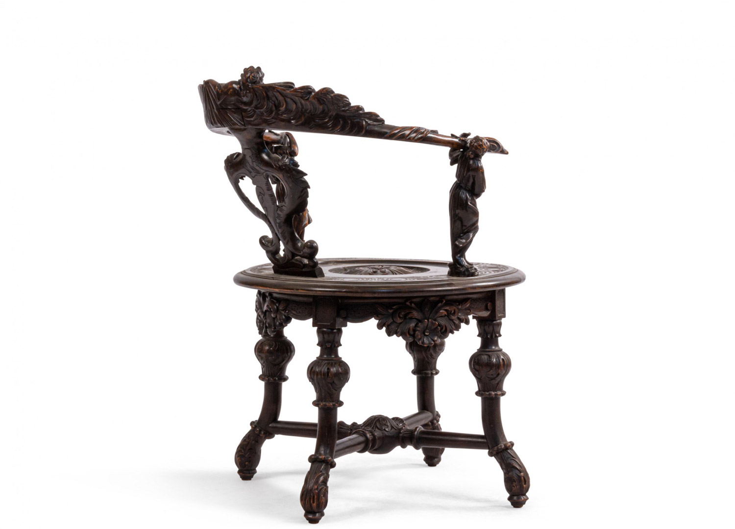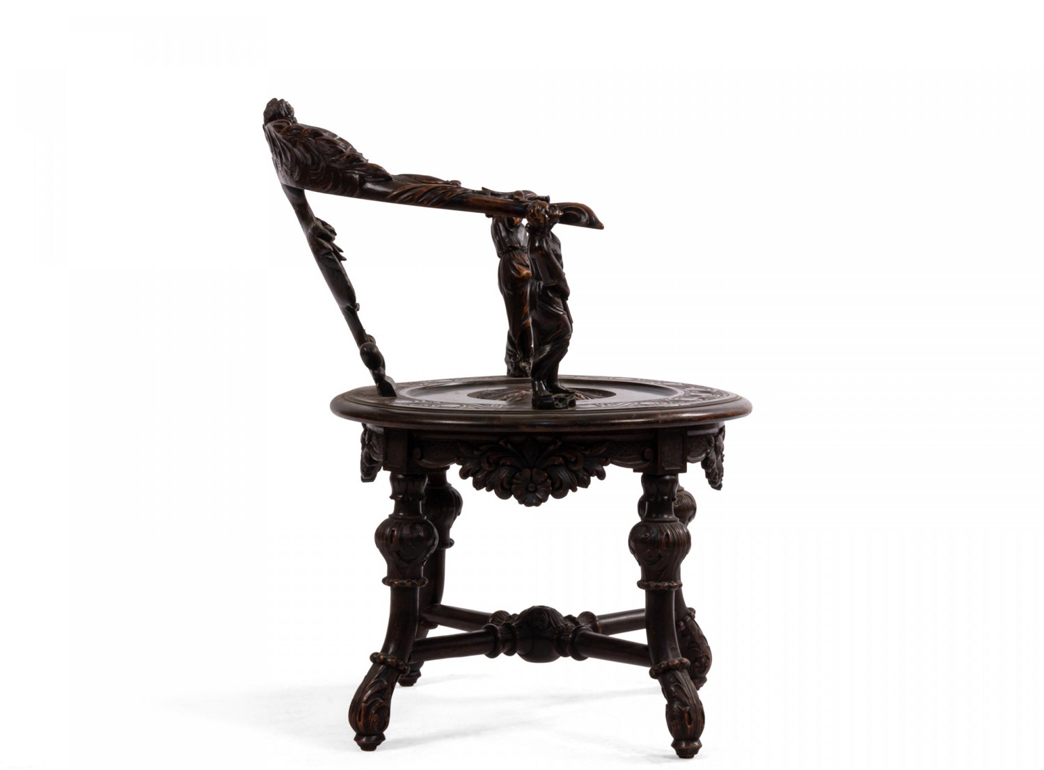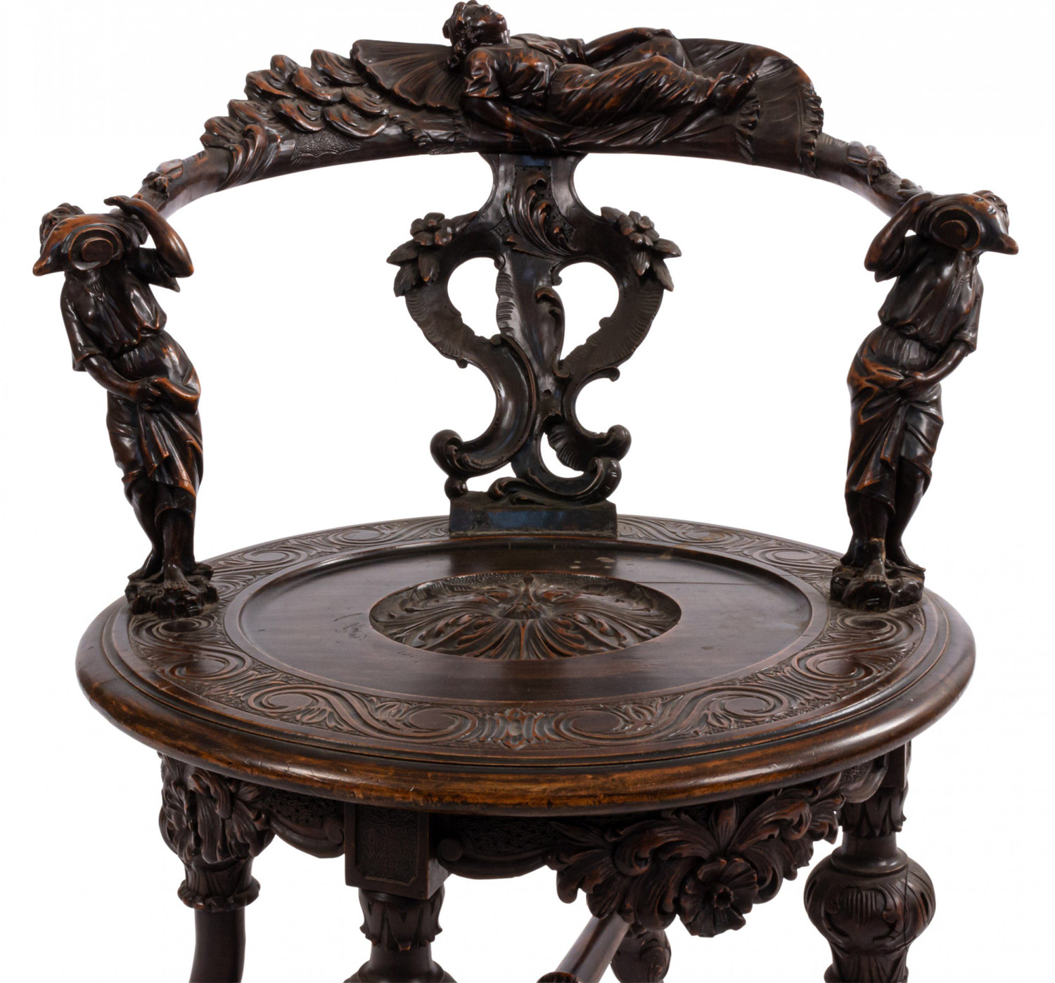 Italian Renaissance-style (19th Century) walnut armchair with carved round back and seat with reclining figures and stretcher..