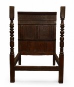 Italian Renaissance-style (17th Century) carved walnut panel full size headboard with large post footboard (includes: headboard, footboard, and rails)..
