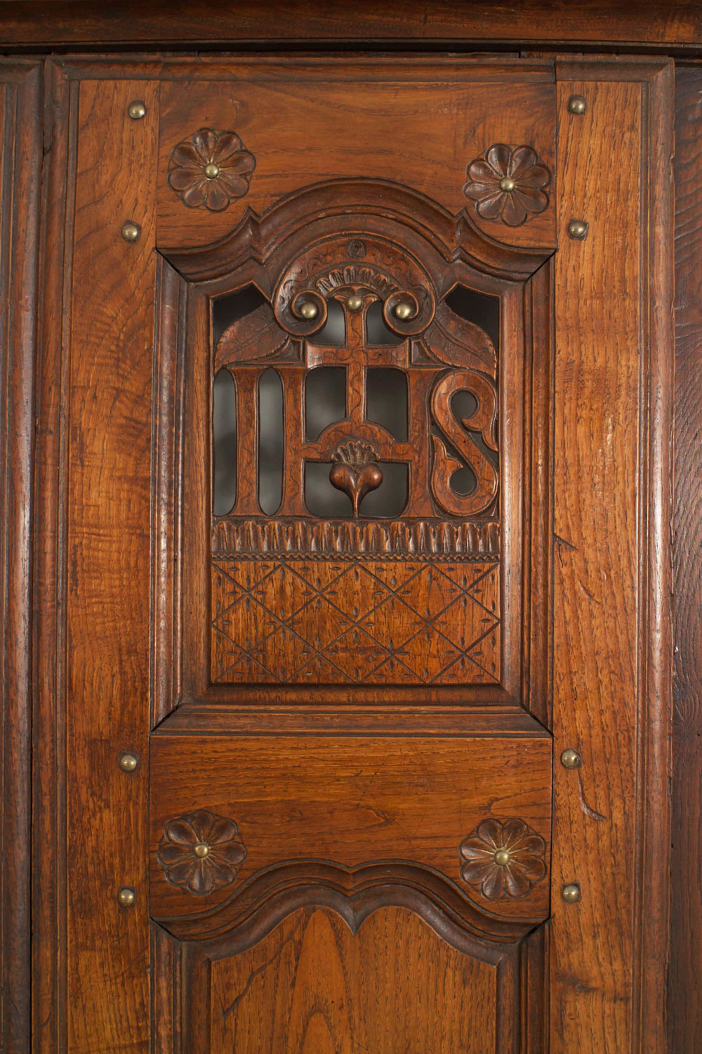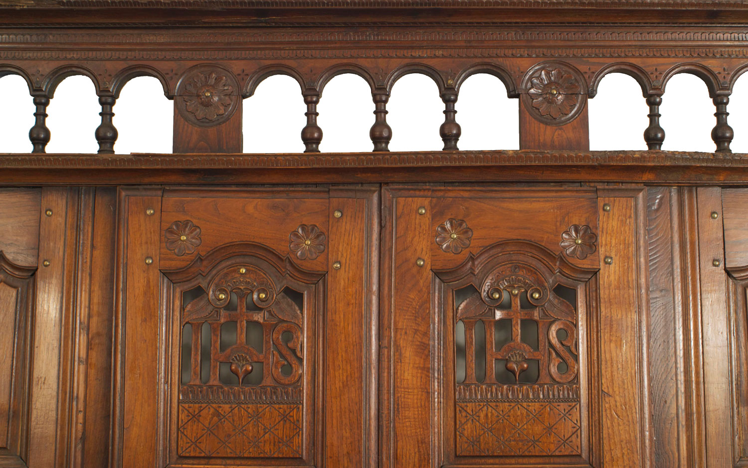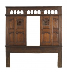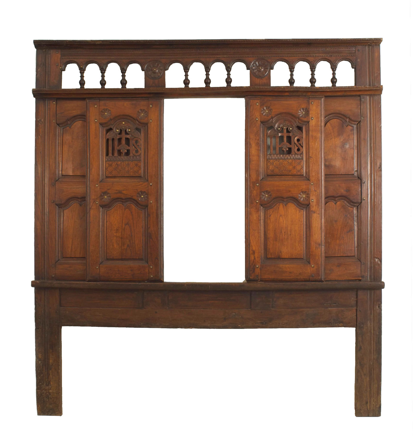 Italian Renaissance-style (18th Century) walnut headboard with an open design top under a panel door design (originally a confessional having a Jesuit logo)