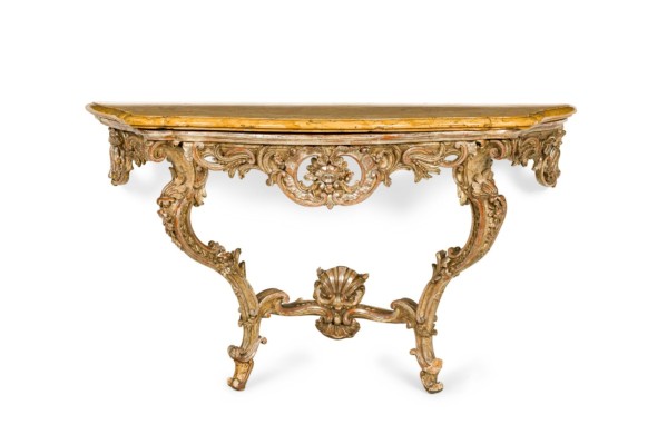 Style: Italian Materials & Techniques: Carved, gilt / giltwood, marble, wood Category: Dining Room Condition: Minor losses to finish and decorations on base. Good; Wear consistent with age and use