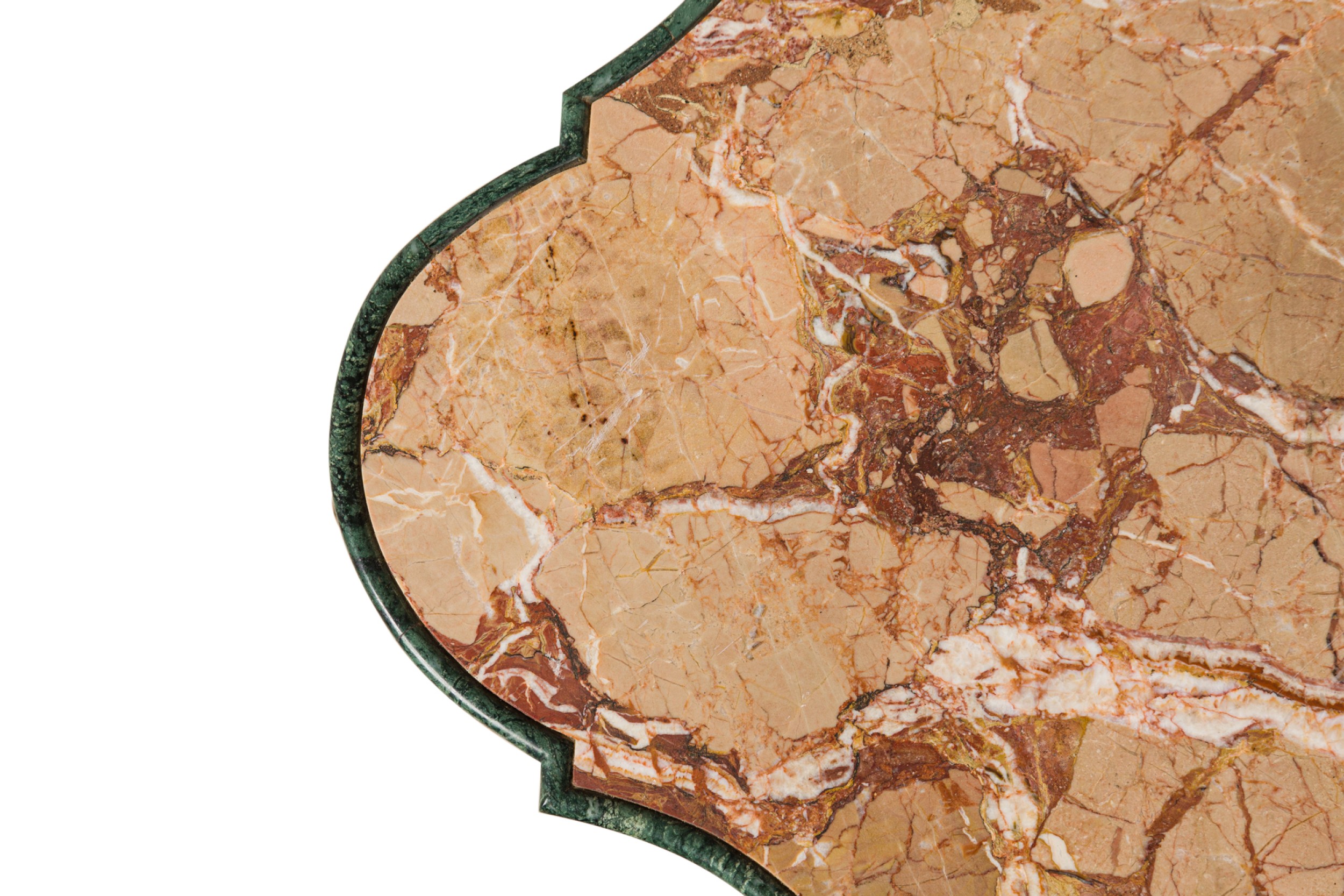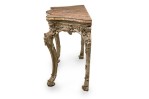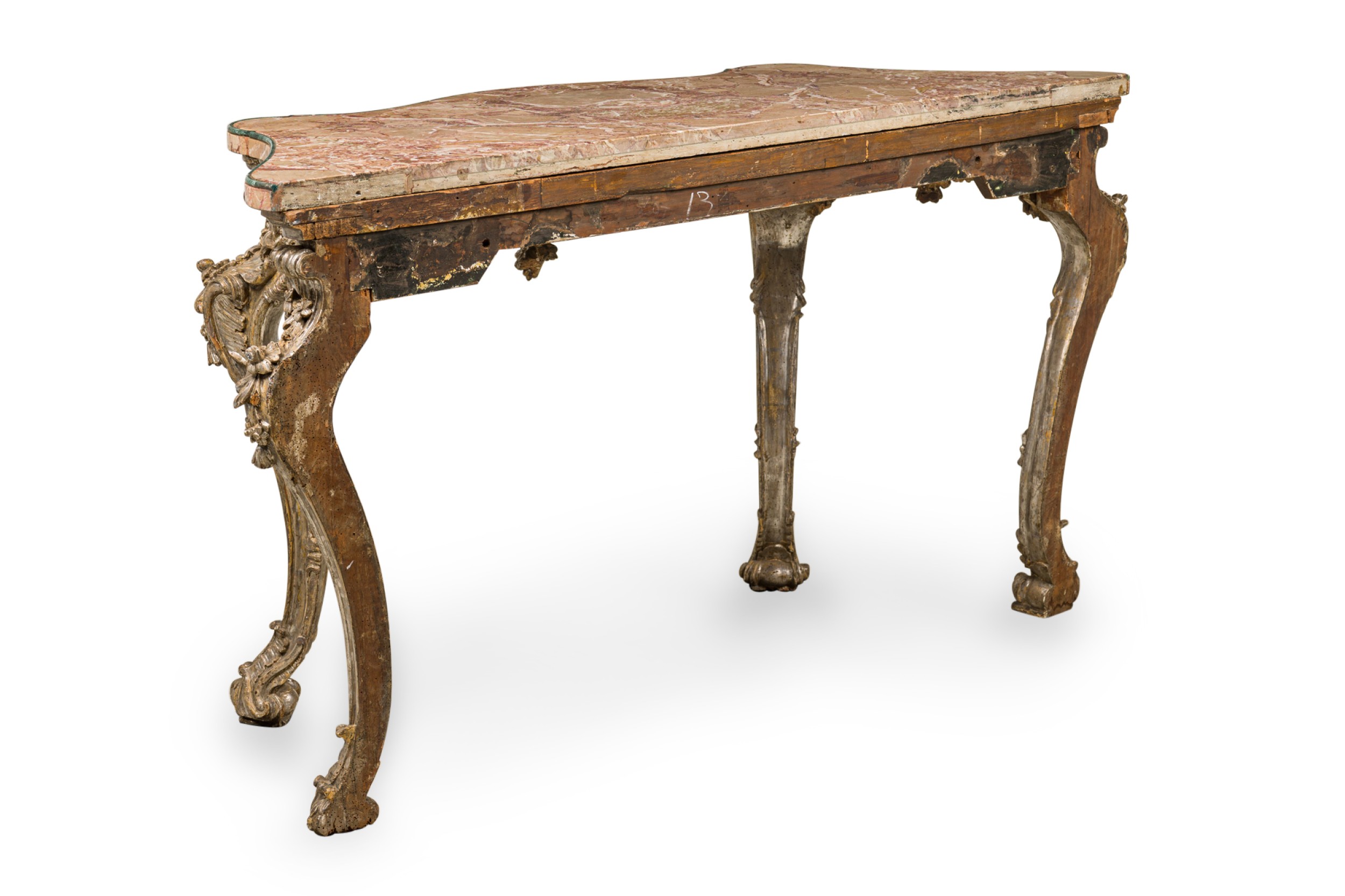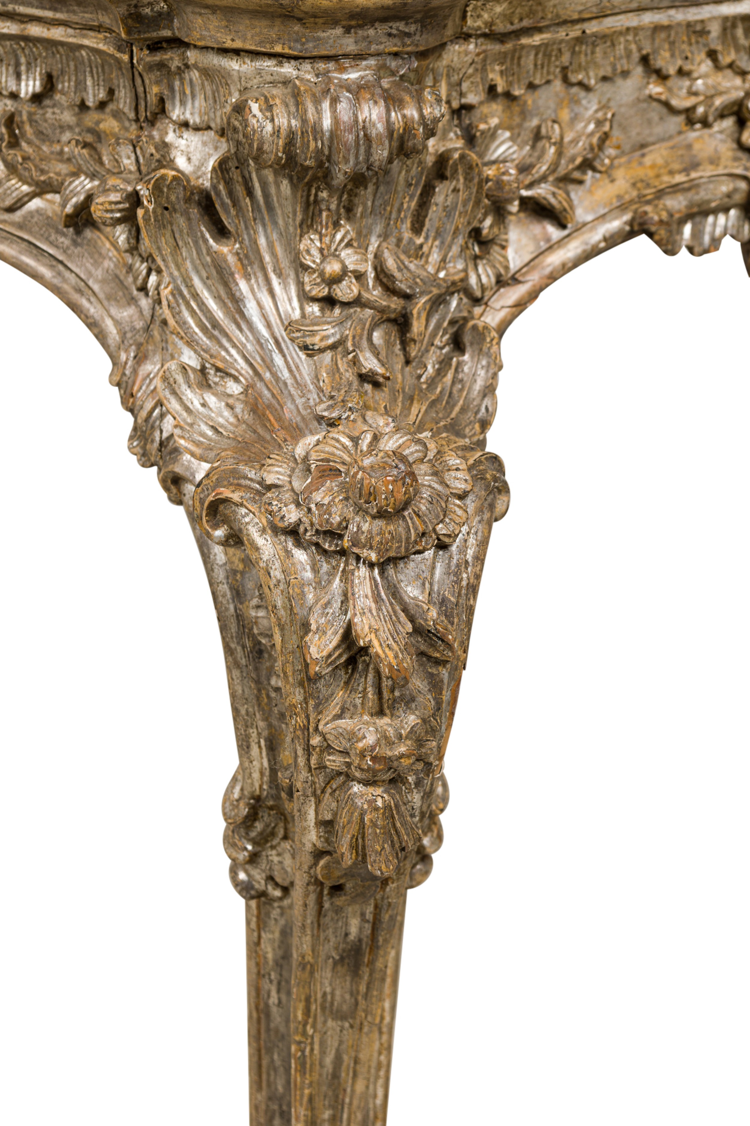 Italian Rococo console table with an ornately carved foliate design silver gilt frame supporting a shaped blush marble top with rounded green marble trim..