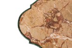 Italian Rococo console table with an ornately carved foliate design silver gilt frame supporting a shaped blush marble top with rounded green marble trim.