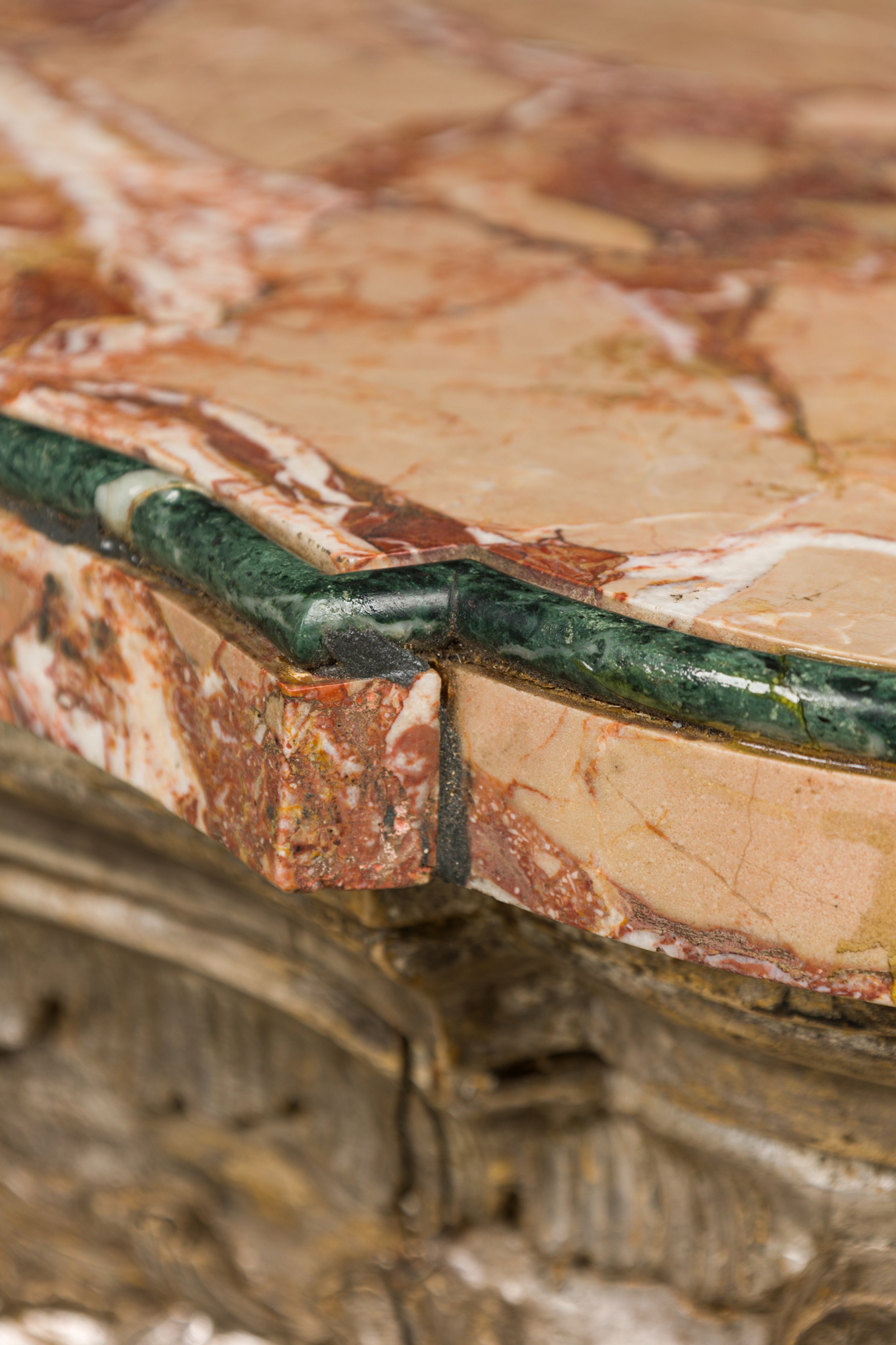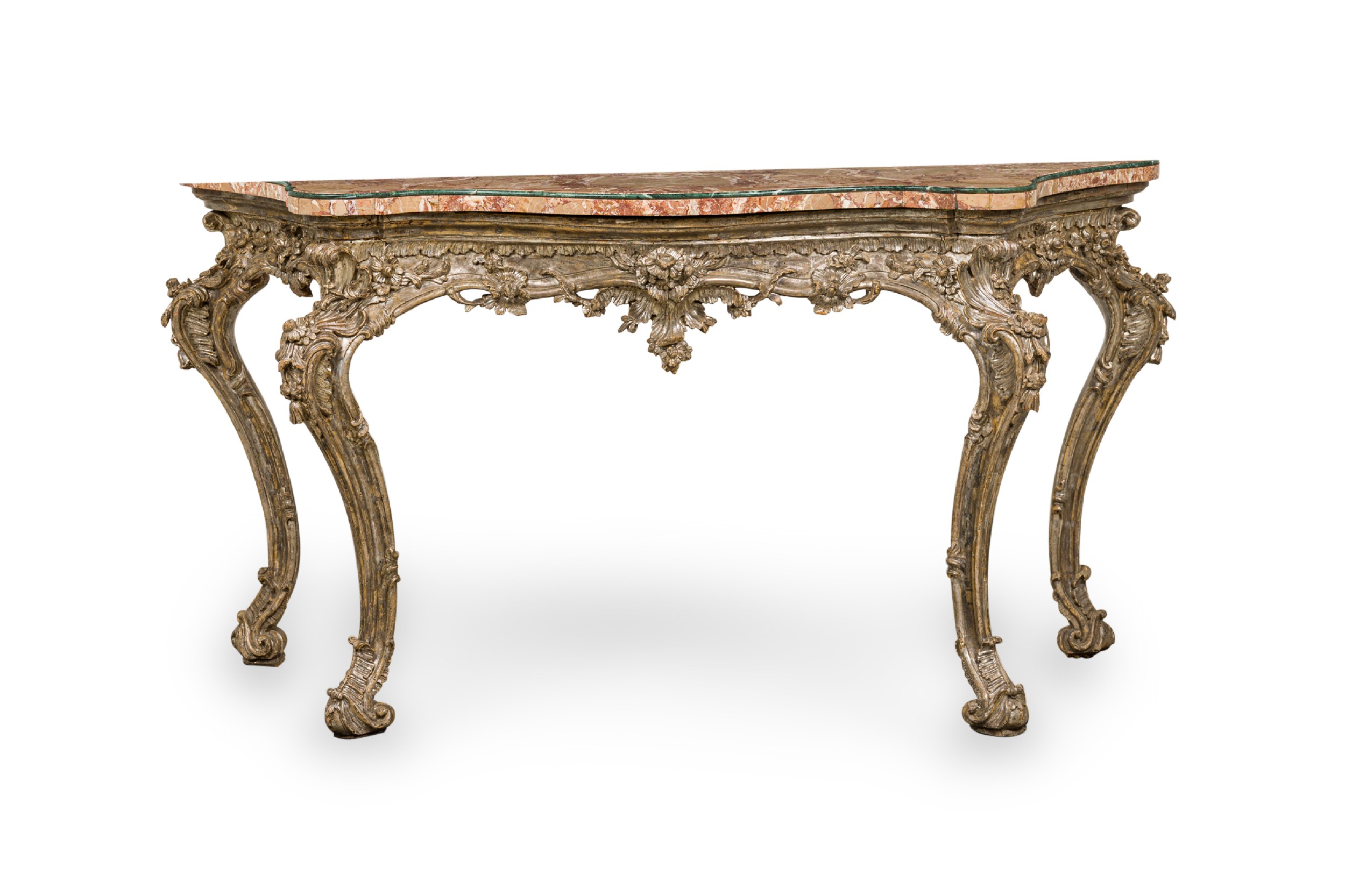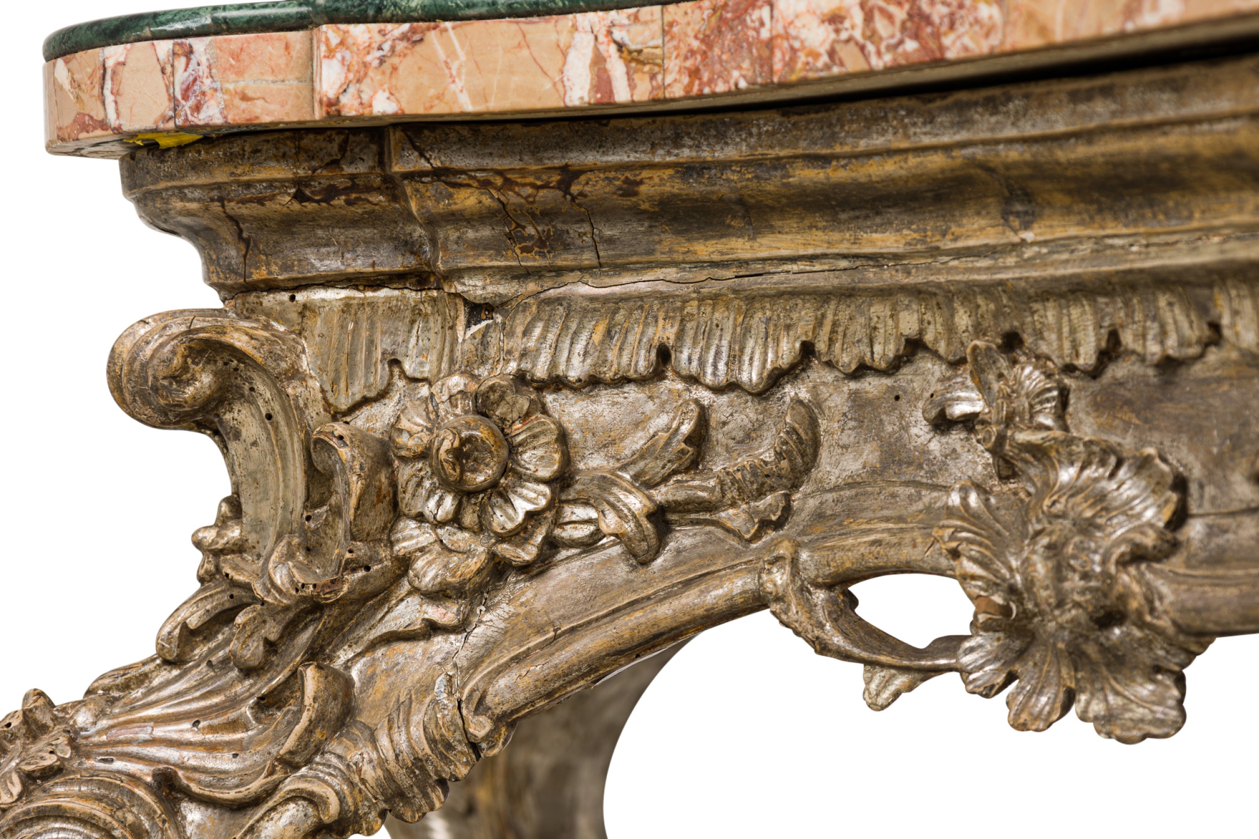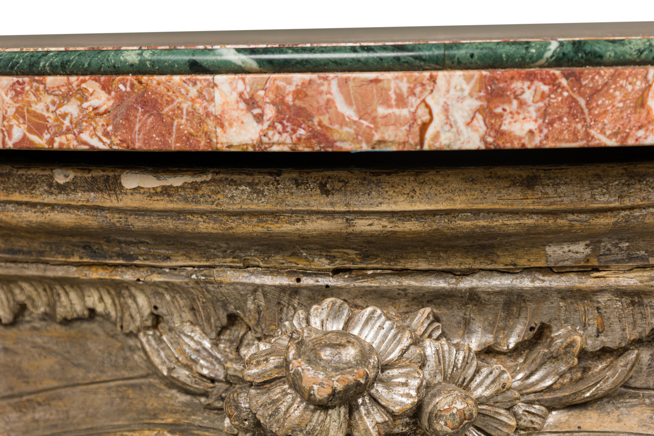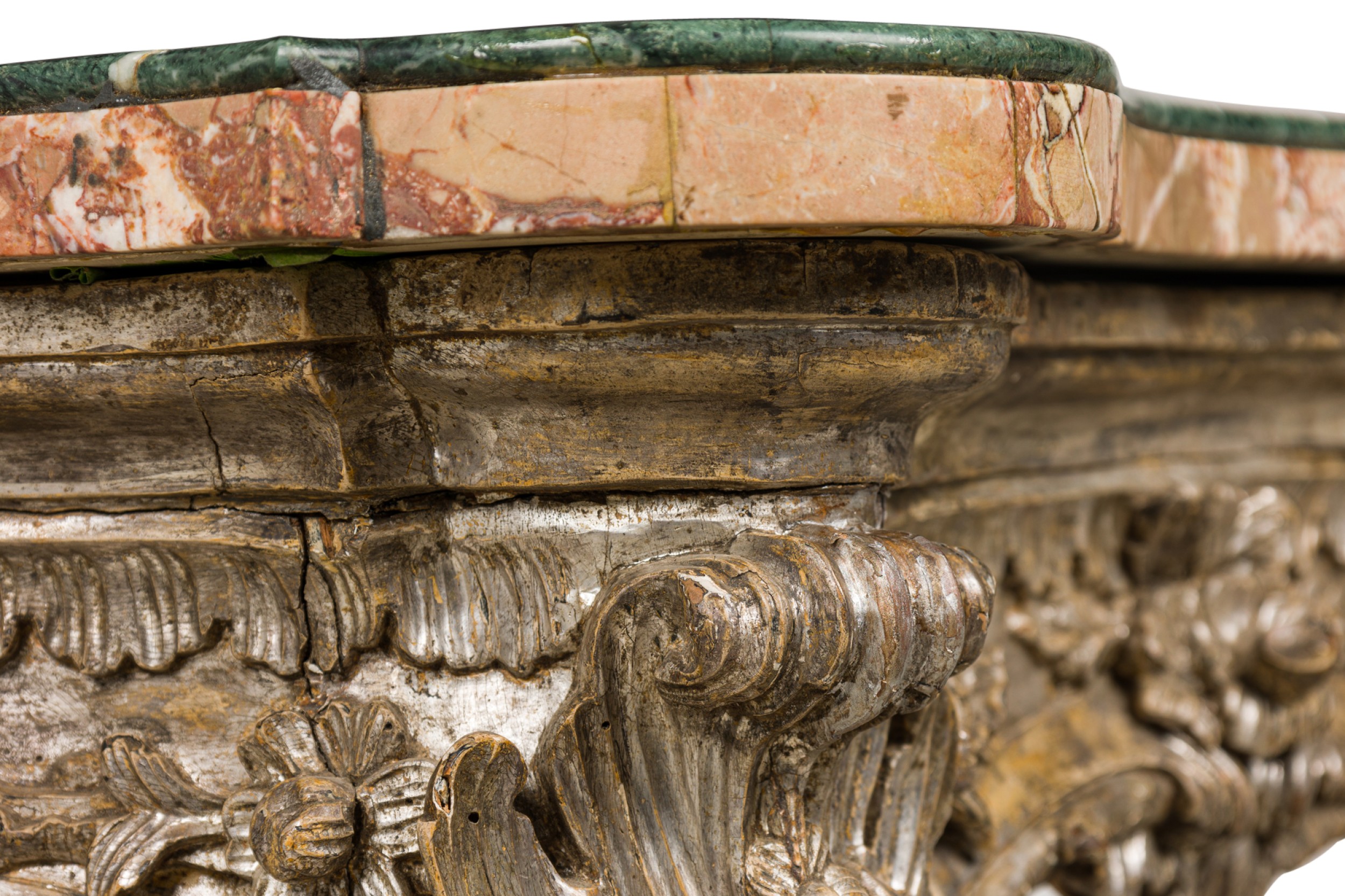 Italian Rococo Carved Silver Gilt and Blush and Green Marble Top Console Table