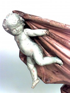 Italian Rococo style (18/19th Cent) carved fruitwood cupid design crib on rustic carved wood base..