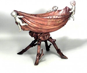 Italian Rococo style (18/19th Cent) carved fruitwood cupid design crib on rustic carved wood base.