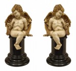 PAIR of Italian Rococo style (20th Cent) white painted composition cupid figures with gilt wings and mounted on black column bases