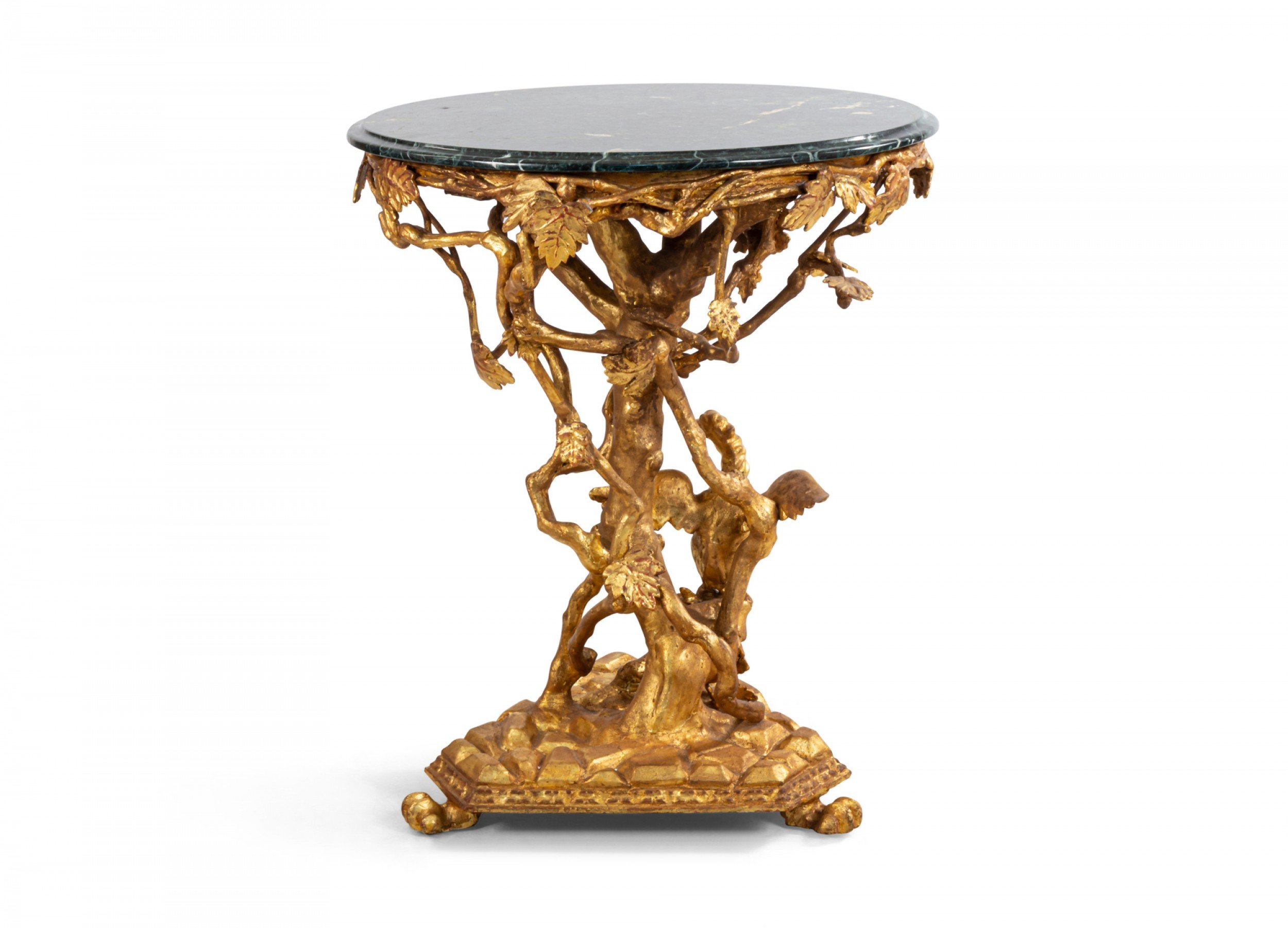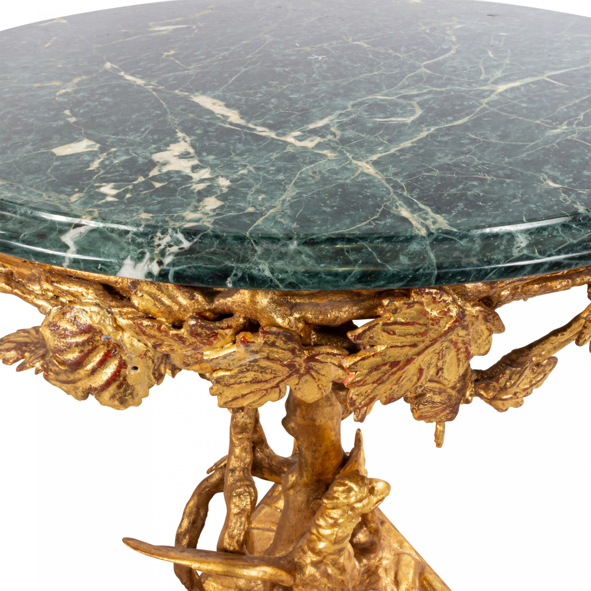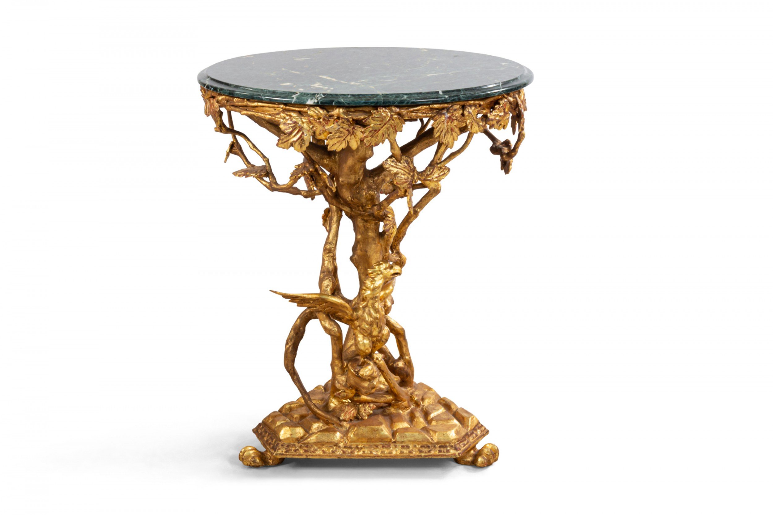 Italian Rococo (18th Century) gilt round end table with a floral carved design and eagle figure resting on a triangular base with an apron supporting a round green marble top.