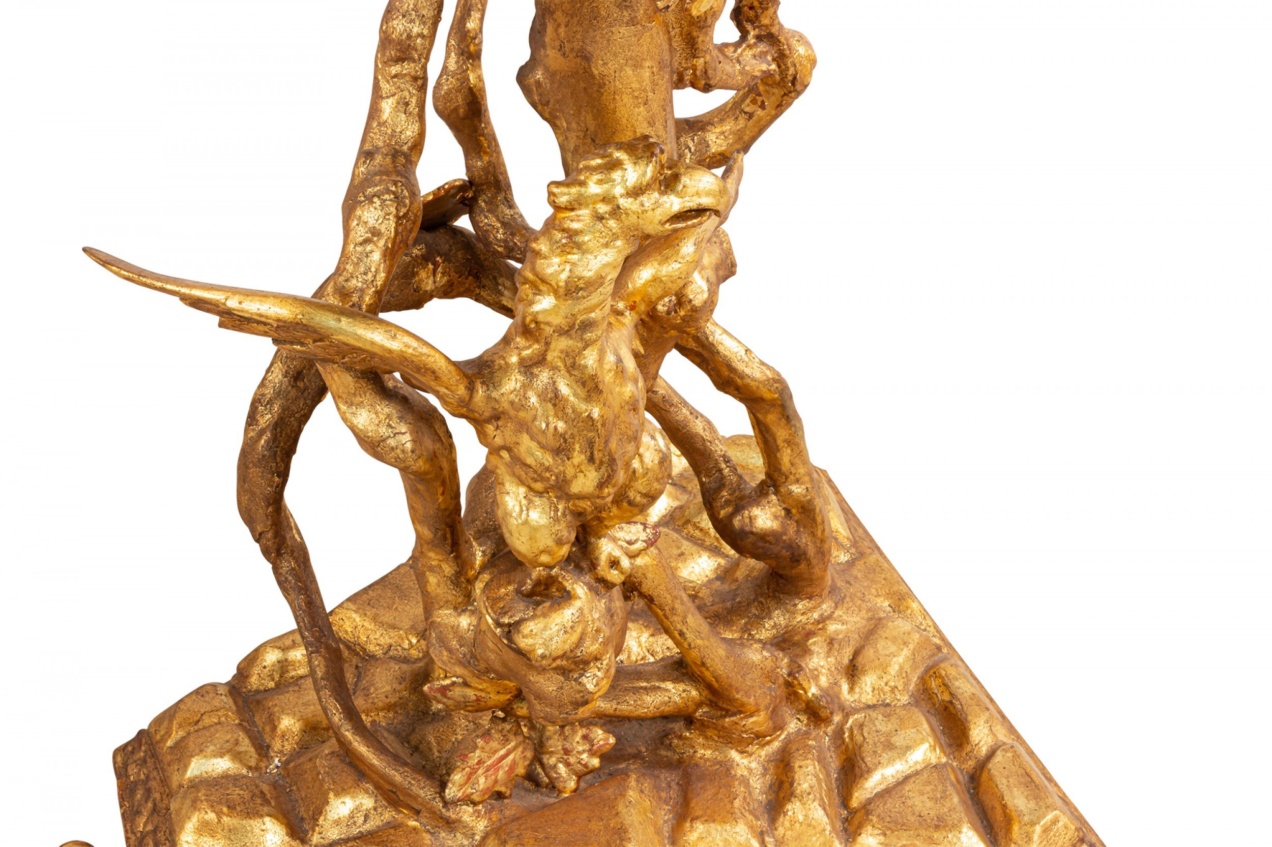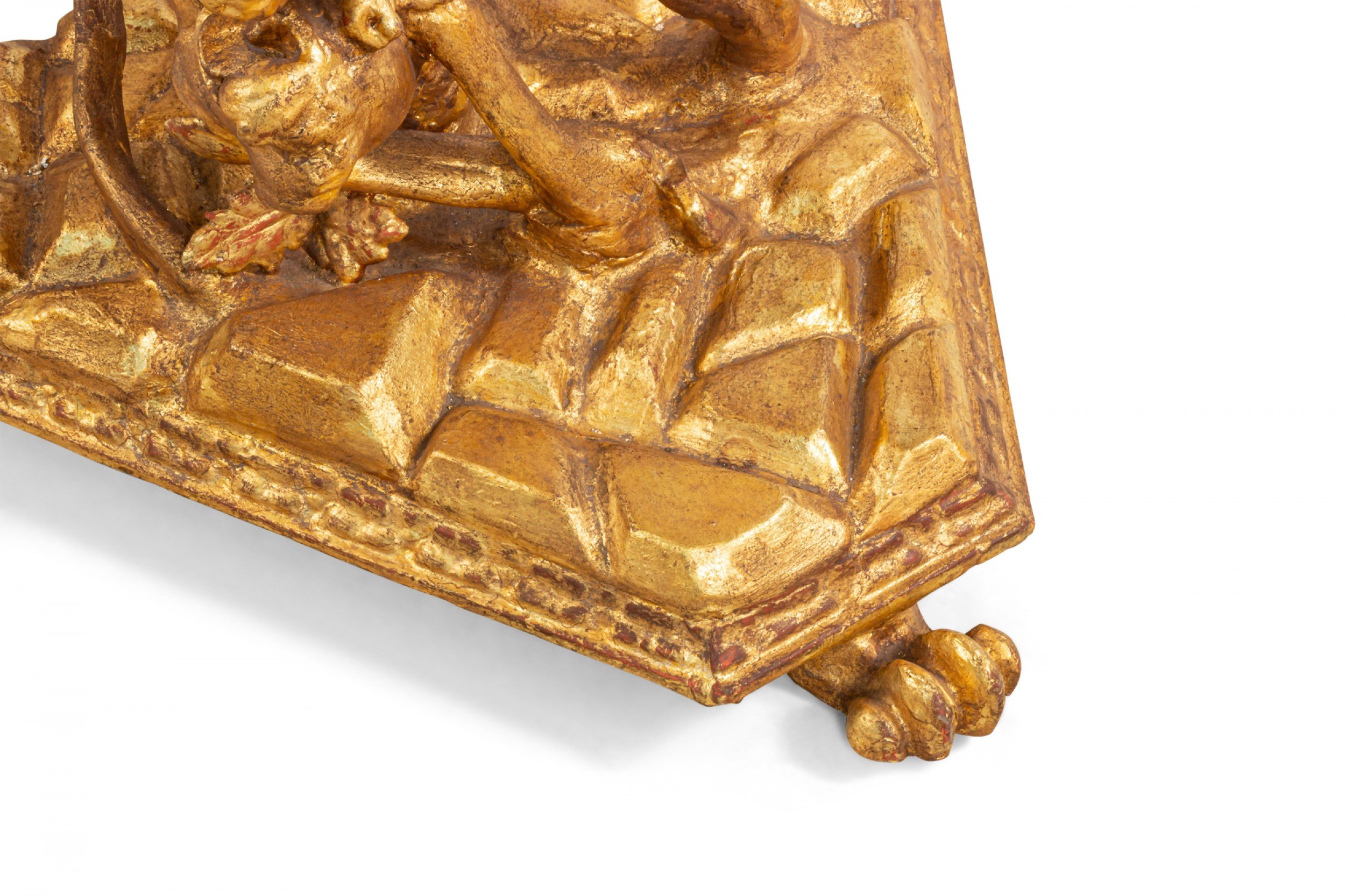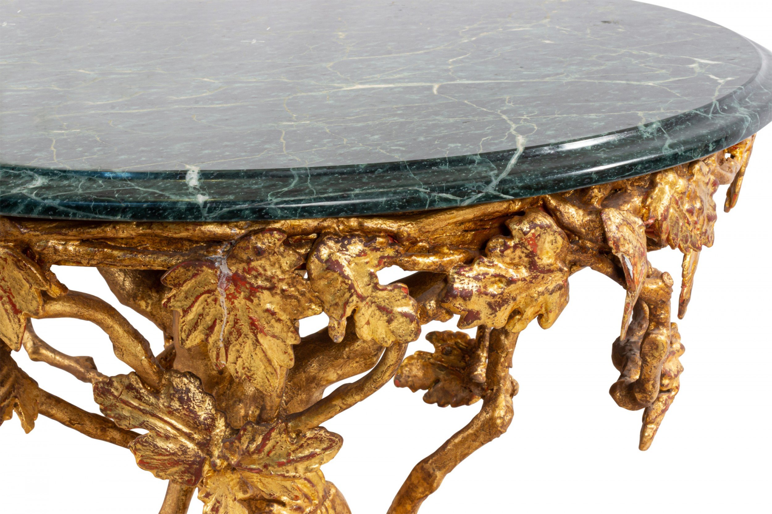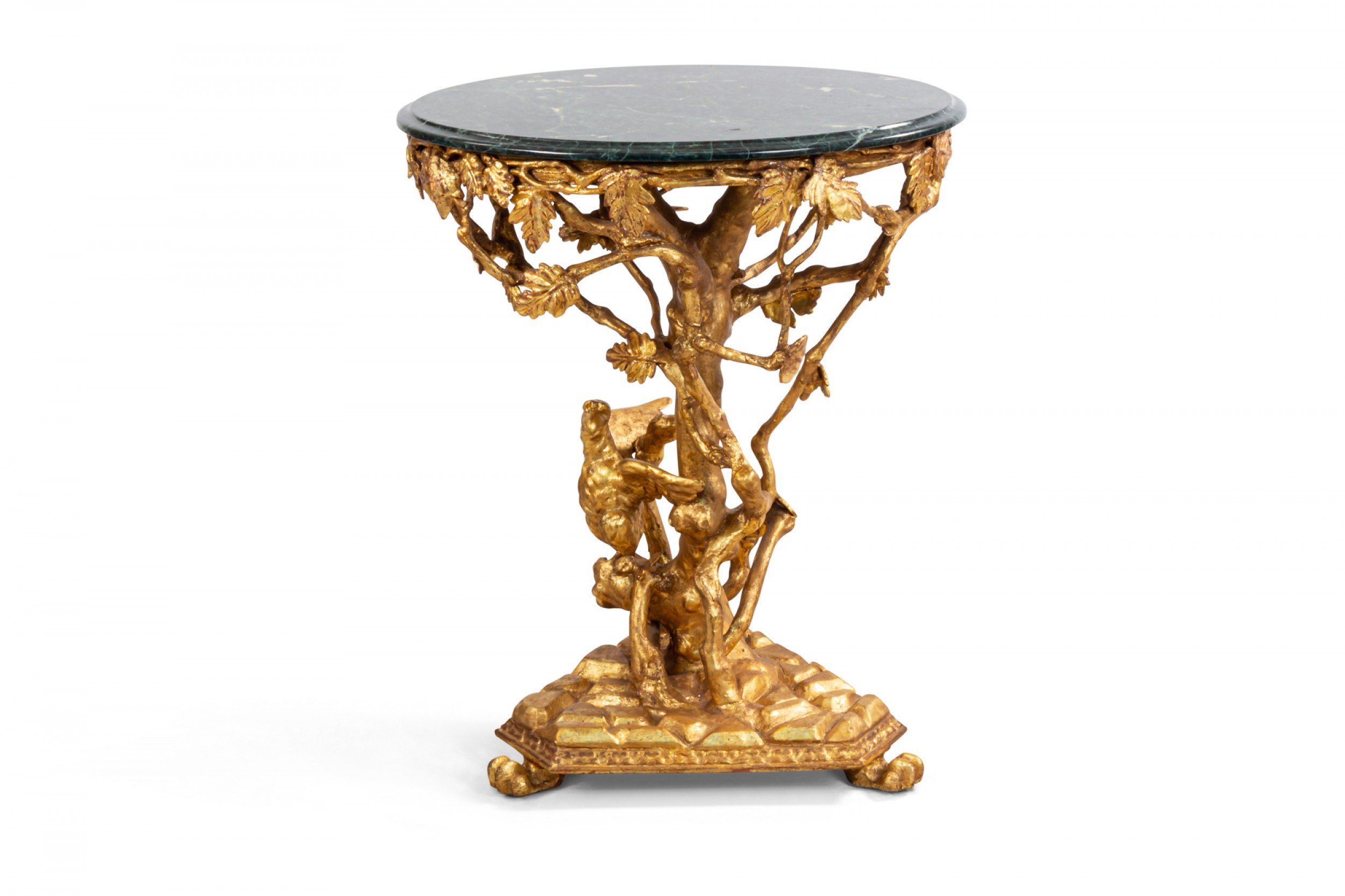 Italian Rococo (18th Century) gilt round end table with a floral carved design and eagle figure resting on a triangular base with an apron supporting a round green marble top.