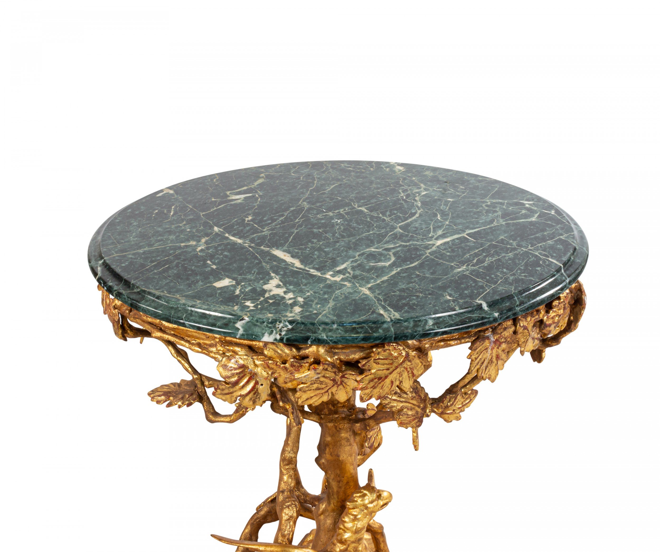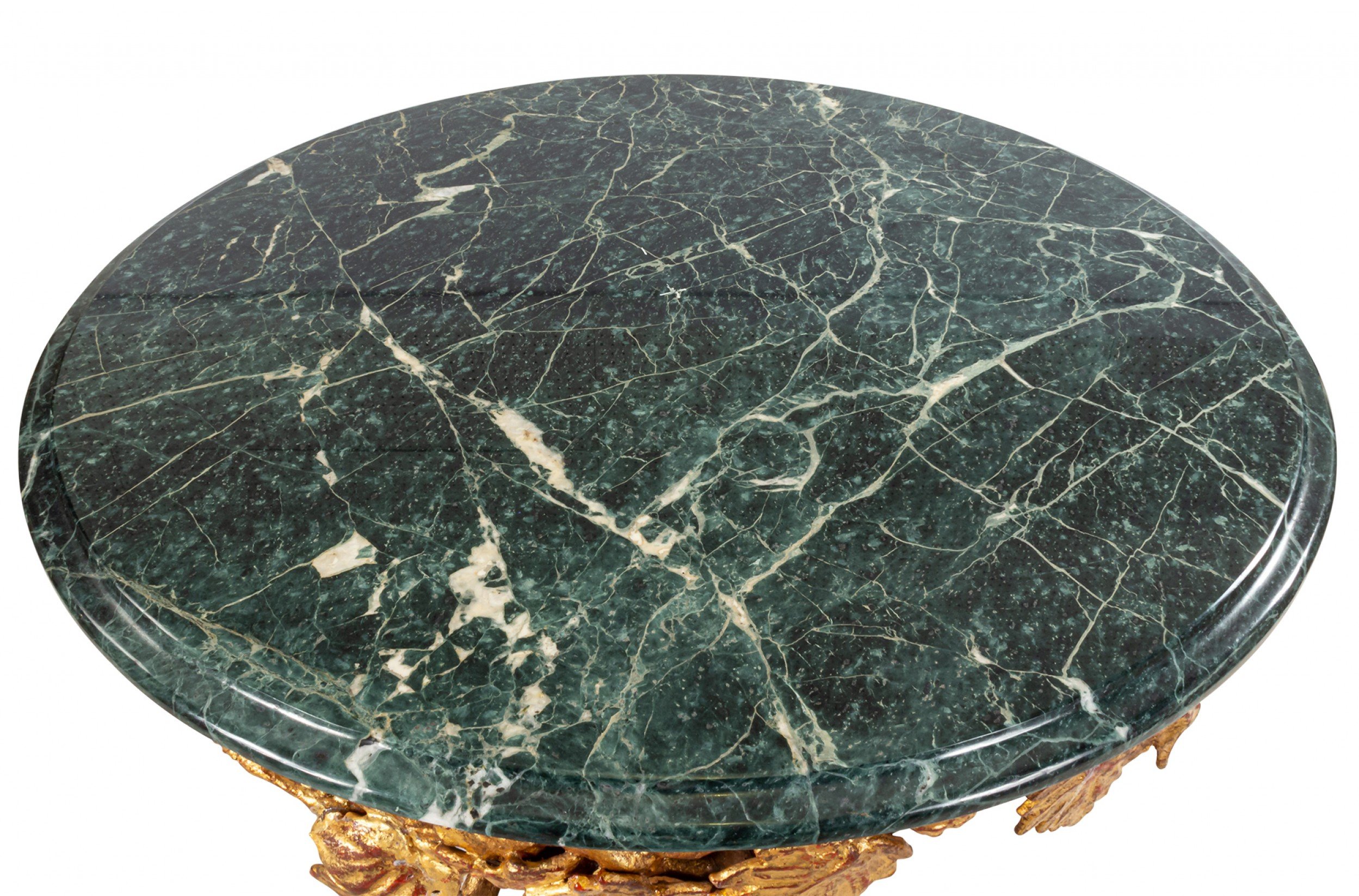 Italian Rococo (18th Century) gilt round end table with a floral carved design and eagle figure resting on a triangular base with an apron supporting a round green marble top..