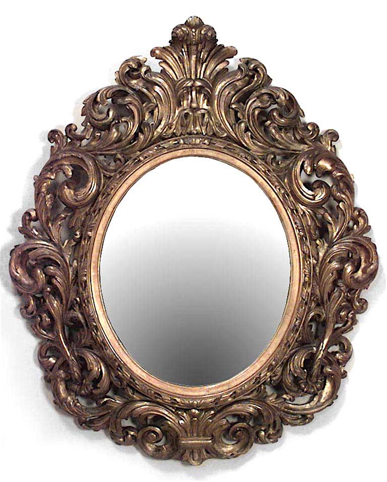 Italian Rococo-style (19th Century) giltwood wall mirror with oval plate within a carved scroll surrounding frame.