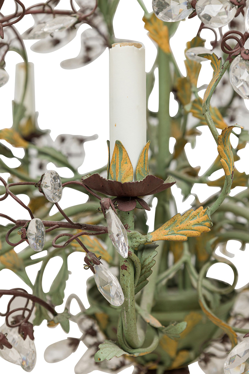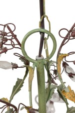 Italian Rococo Style (Mid-Century) 10 arm chandelier having gold floral and foliage elements with intricate crystal drops supported on green arms that are asymmetrically arranged bearing candle stand-like bulb holders with a canopy.